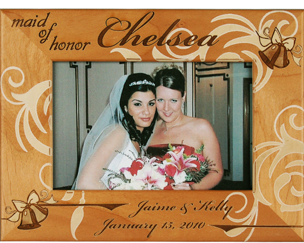 Your maid of honor is a planner, organizer, supporter, therapist, confidante, dear friend, and more. Show her how much she means with a beautiful engraved wooden frame. This personalized wedding party gift can feature the recipient’s name as well as your wedding details. Our wedding picture frame is a perfect way to reflect the unique mark your Maid of Honor made on your wedding day. Item# wed0006