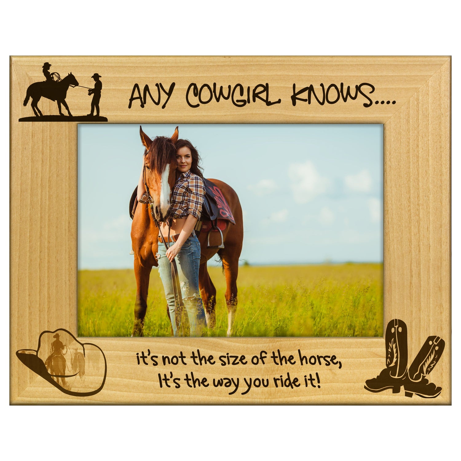 Capture your favorite memories in style with our engraved wooden picture frame, perfect for any cowgirl's home. This frame features a charming design that adds a rustic touch to your decor.