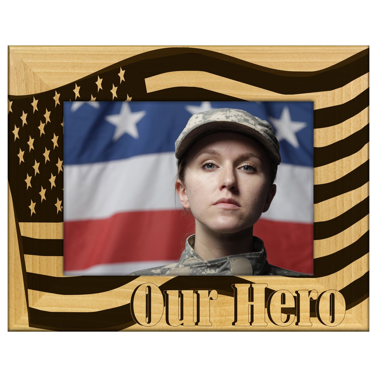 Celebrate your love for the USA with our Hero USA Flag Themed Engraved Wooden Picture Frame. This frame features a stunning engraved design that showcases the iconic stars and stripes, making it the perfect way to display your cherished memories.