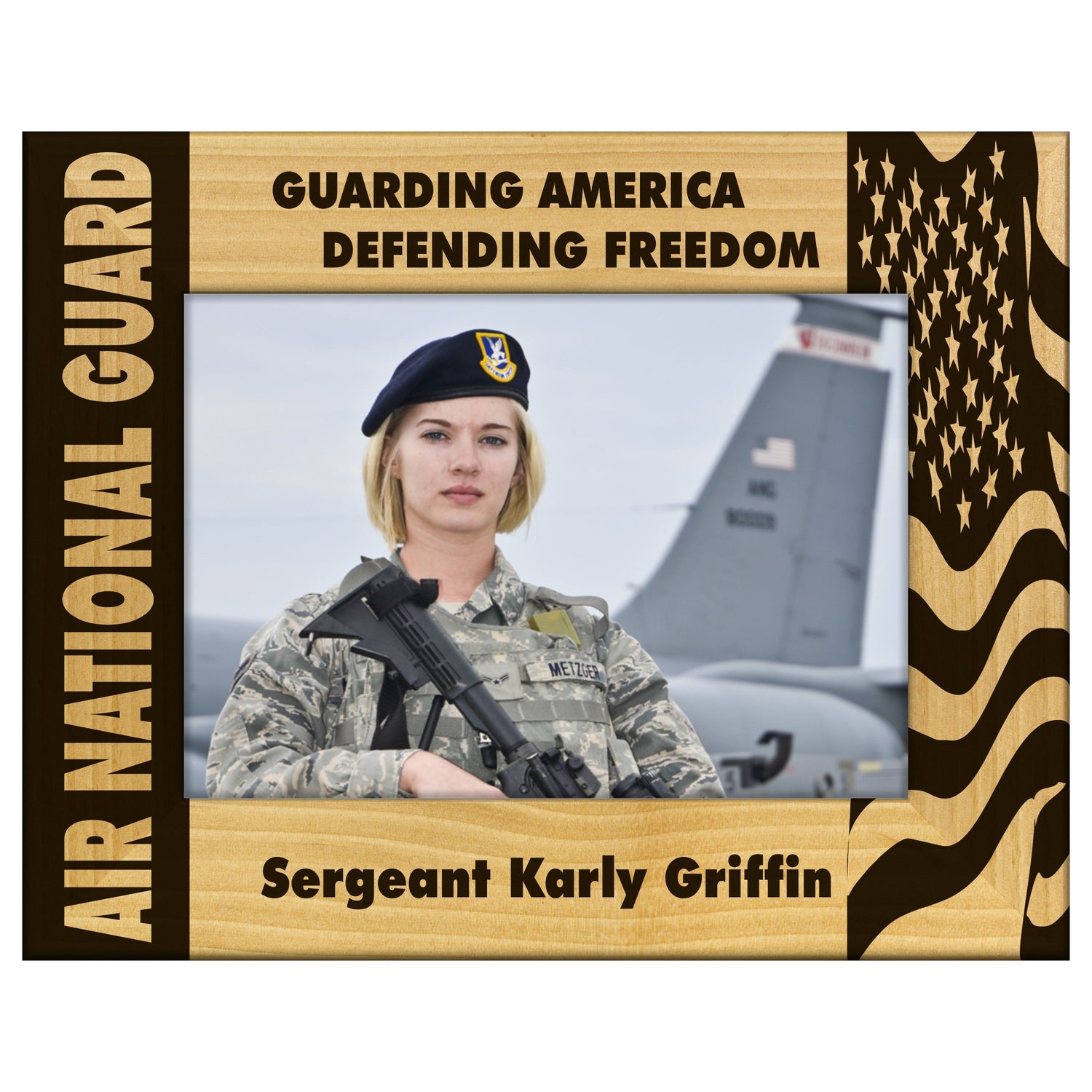 Showcase your pride with our Air National Guard themed engraved wooden picture frame. This frame features a beautifully engraved design that honors the dedication and service of the Air National Guard. Perfect for displaying cherished memories, it adds a personal touch to any home or office.