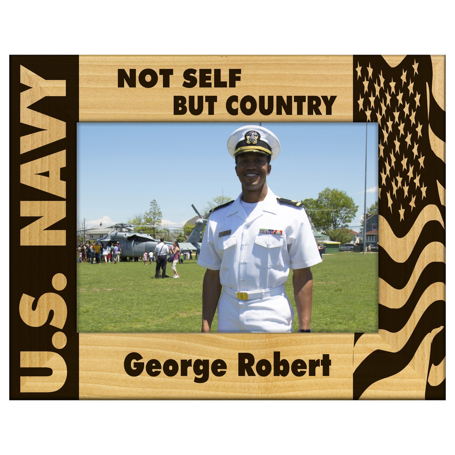 Showcase your cherished memories with our US Navy-themed engraved wooden picture frame. This frame features a beautifully detailed engraving that pays tribute to the bravery and dedication of the Navy.