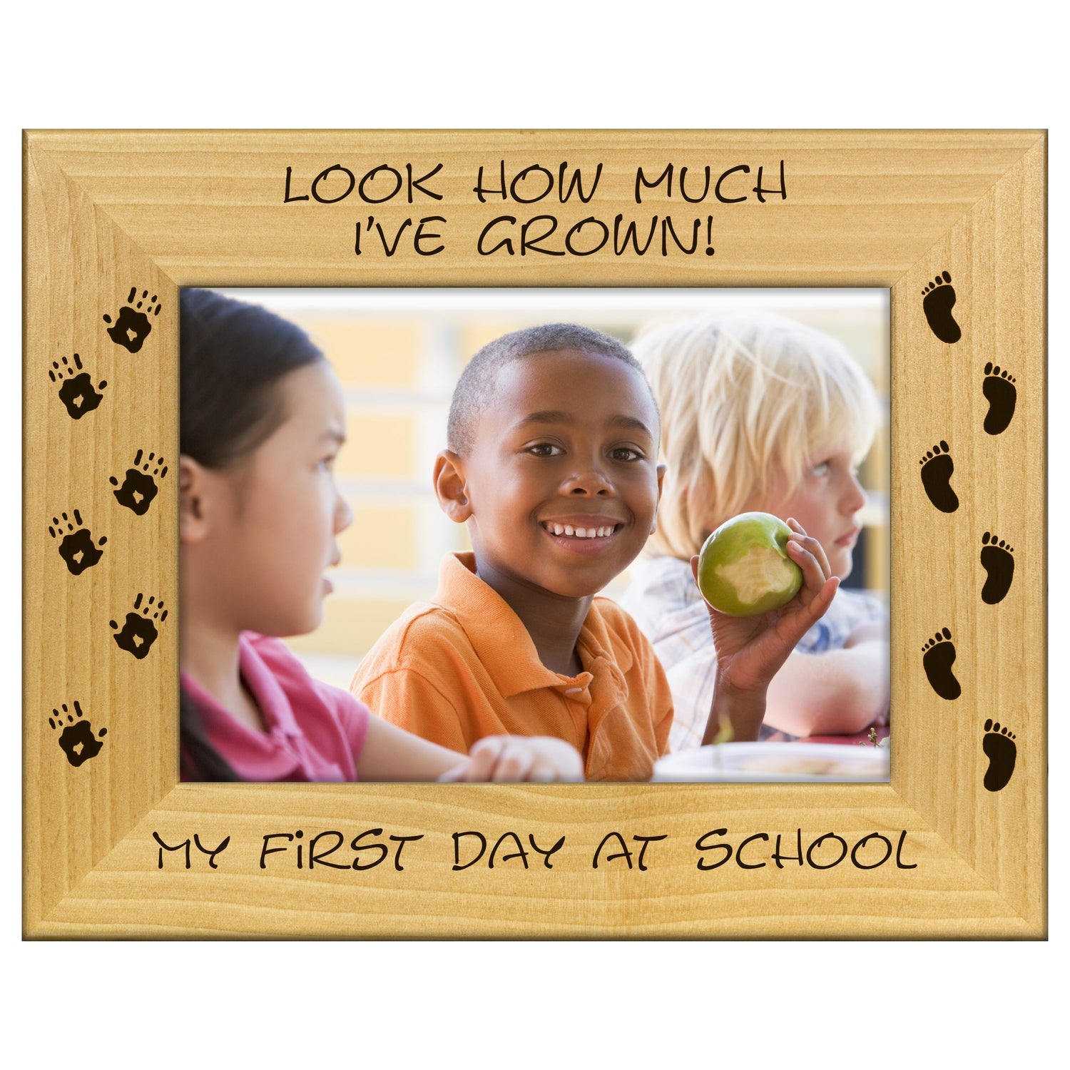 Capture the magic of your child's first day of school with our beautifully engraved wooden picture frame. This charming frame not only showcases their adorable photo, but also features a heartfelt inscription that commemorates this special milestone.
