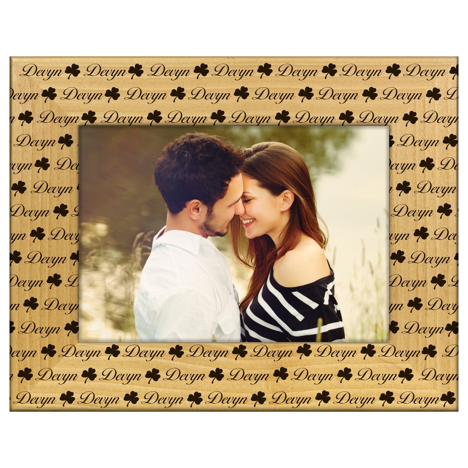 Celebrate your Irish heritage with the Names Repeating Shamrocks Frame. This charming frame features a delightful pattern of shamrocks, perfect for showcasing your favorite memories.