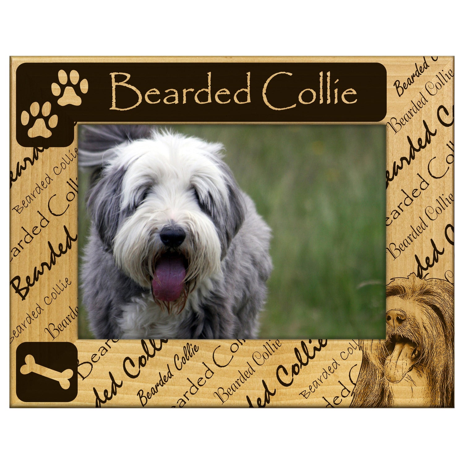 Capture your cherished memories with our Bearded Collie Engraved Wooden Picture Frame. This frame features a beautifully detailed engraving of the beloved Bearded Collie, making it a perfect gift for dog lovers or a stylish addition to your home decor.