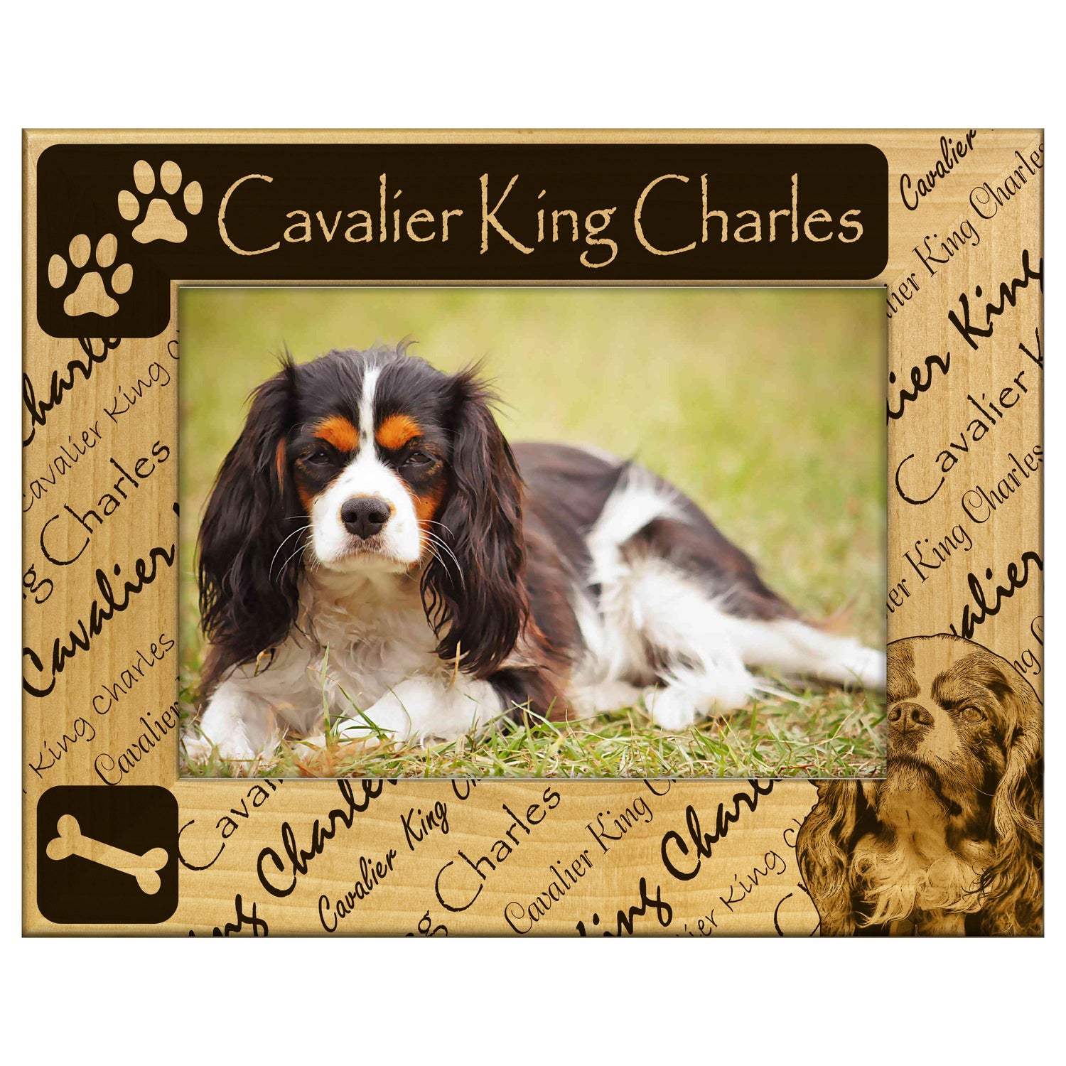 Celebrate your love for the Cavalier King Charles Spaniel with this beautifully engraved wooden picture frame. It features a charming design that perfectly showcases your favorite memories with your furry friend.
