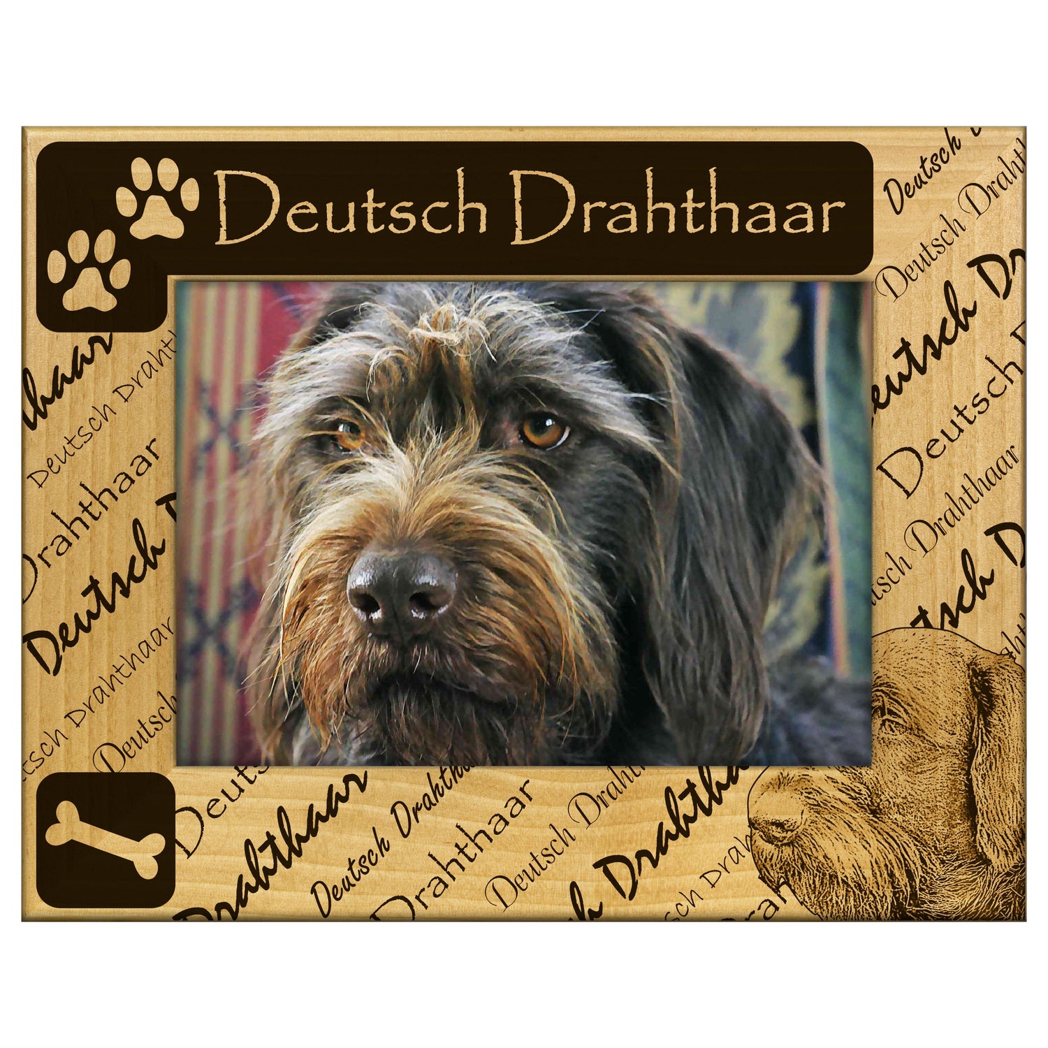 Showcase your love for the Deutsch Drahthaar with this beautifully engraved wooden picture frame. It features a stunning design that highlights your favorite memories with your furry friend.