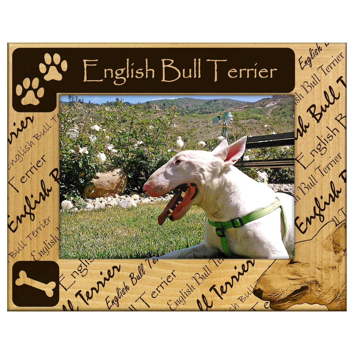 Celebrate your love for the English Bull Terrier with this beautifully engraved wooden picture frame, designed to showcase your favorite memories with your furry friend. It features a charming engraving that captures the spirit of this beloved breed, making it a perfect addition to any home.