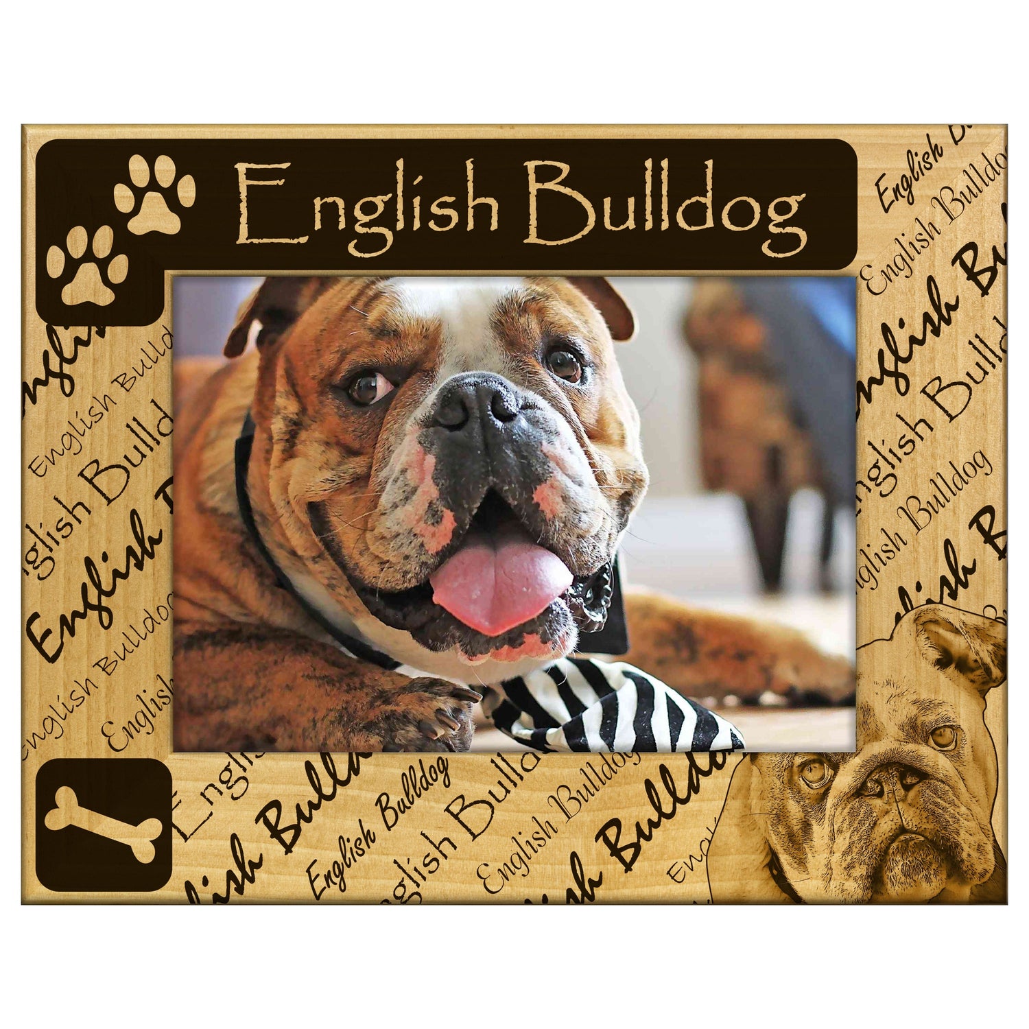 Celebrate your love for English Bulldogs with this beautifully engraved wooden picture frame. It features a charming design that showcases your favorite memories with your furry friend.
