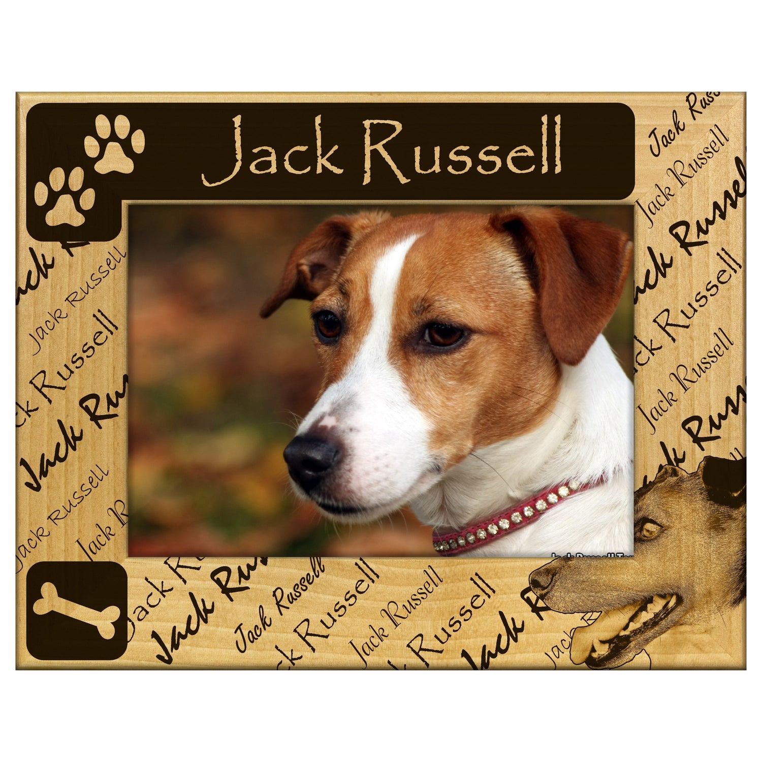Celebrate your love for Jack Russells with our beautifully engraved wooden picture frame. This frame features a charming design that showcases your favorite memories with your furry friend.