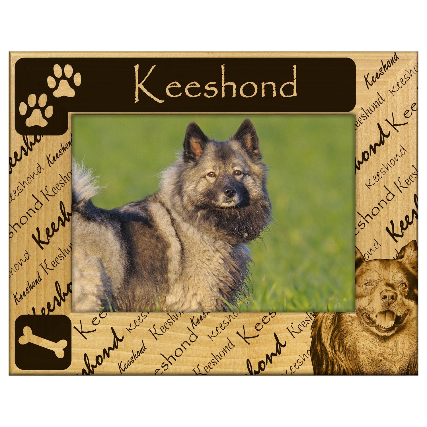Celebrate your love for Keeshonds with this beautifully engraved wooden picture frame, perfect for showcasing your favorite memories with your furry friend. It features a charming Keeshond design that adds a personal touch to any space.