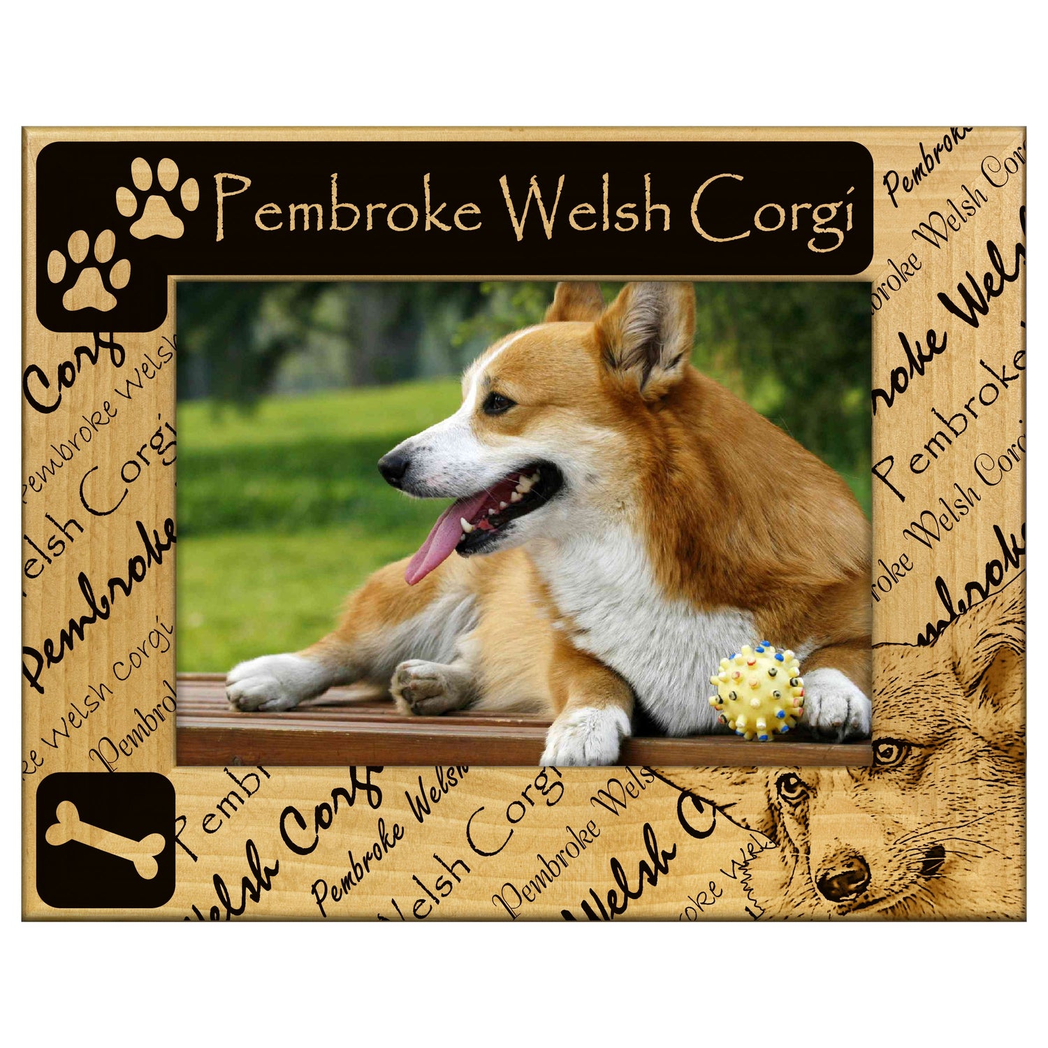 Showcase your love for Pembroke Welsh Corgis with this beautifully engraved wooden picture frame. It features a charming design that perfectly complements your favorite photos of your furry friend.