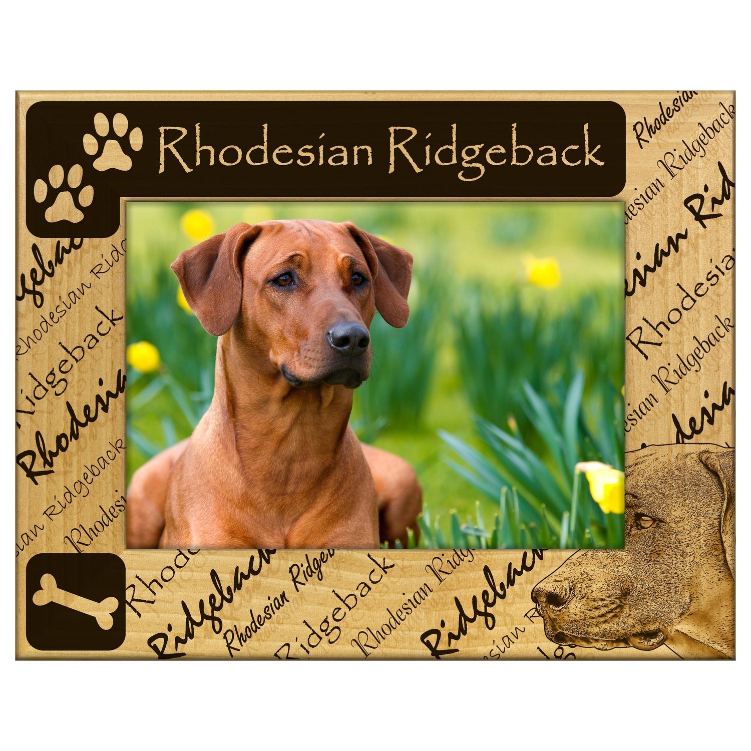 Celebrate your love for Rhodesian Ridgebacks with this beautifully engraved wooden picture frame, perfect for showcasing your favorite memories. It features a stunning design that highlights the unique silhouette of this loyal breed.