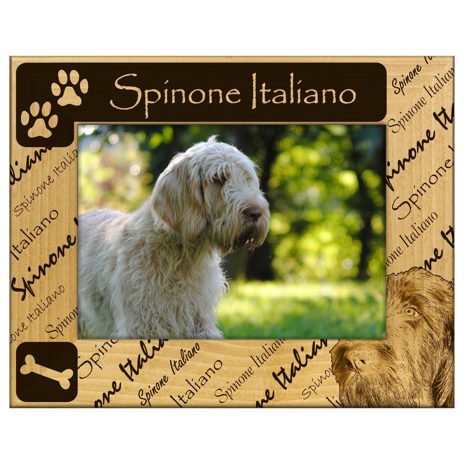 Celebrate your love for the Spinone Italiano with this beautifully engraved wooden picture frame. It features a stunning design that showcases your favorite memories while adding a touch of elegance to any space.