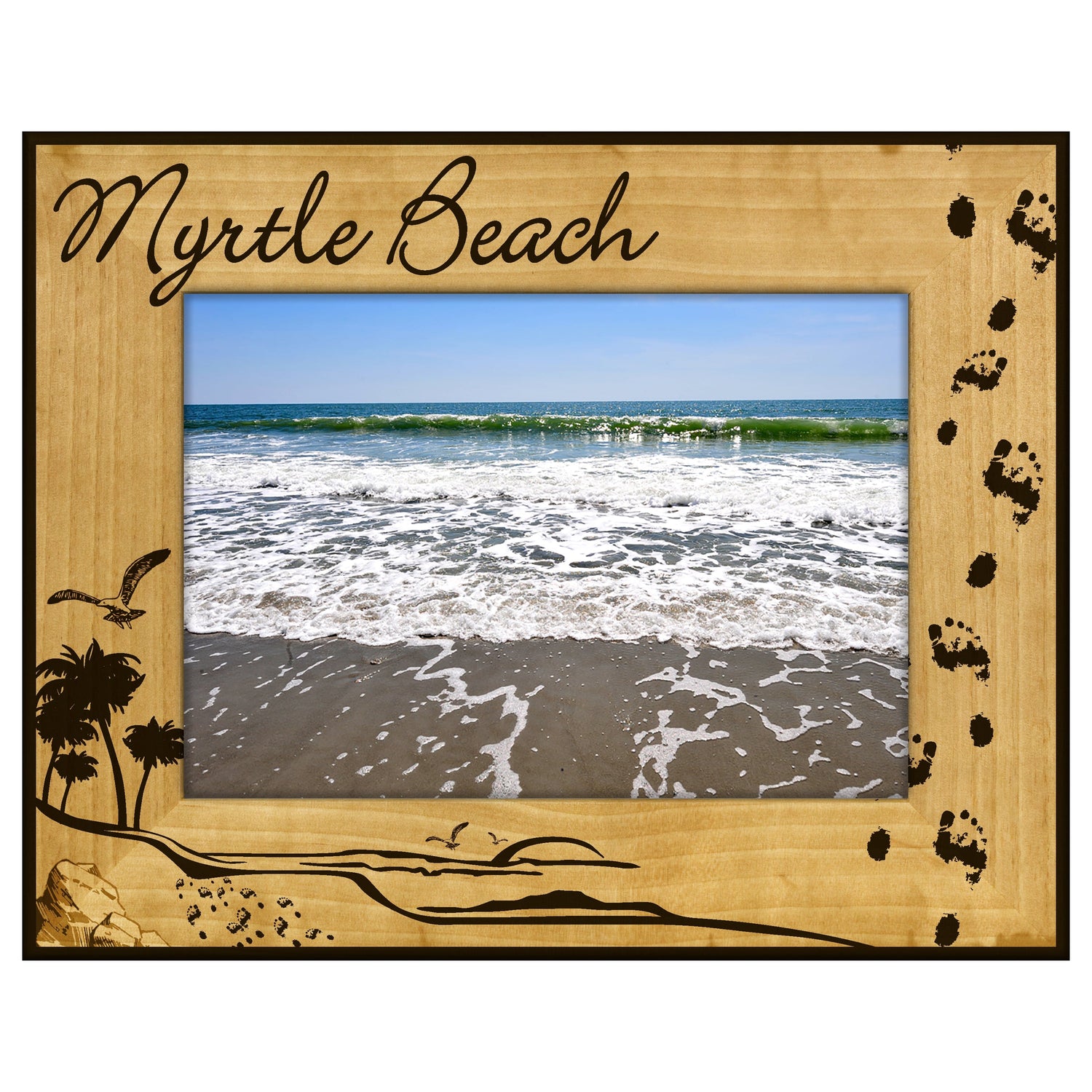 Capture your cherished memories with the Myrtle Beach Footprints Engraved Wooden Picture Frame. This beautifully crafted frame features a unique design that showcases the iconic footprints in the sand, making it a perfect keepsake for your beach adventures.