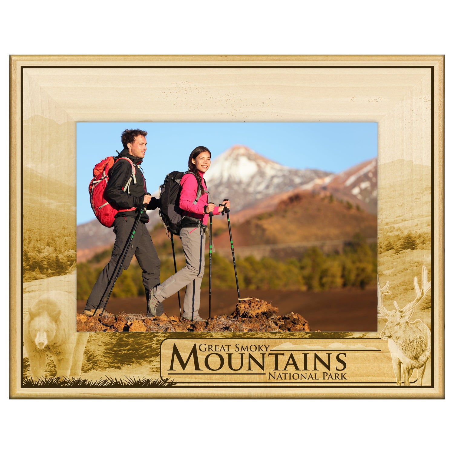 Capture your cherished memories with our Great Smoky Bear and Elk engraved wooden picture frame. This frame features intricate engravings of the iconic Smoky Mountains with a Bear and majestic elk, adding a touch of nature's beauty to your home decor.