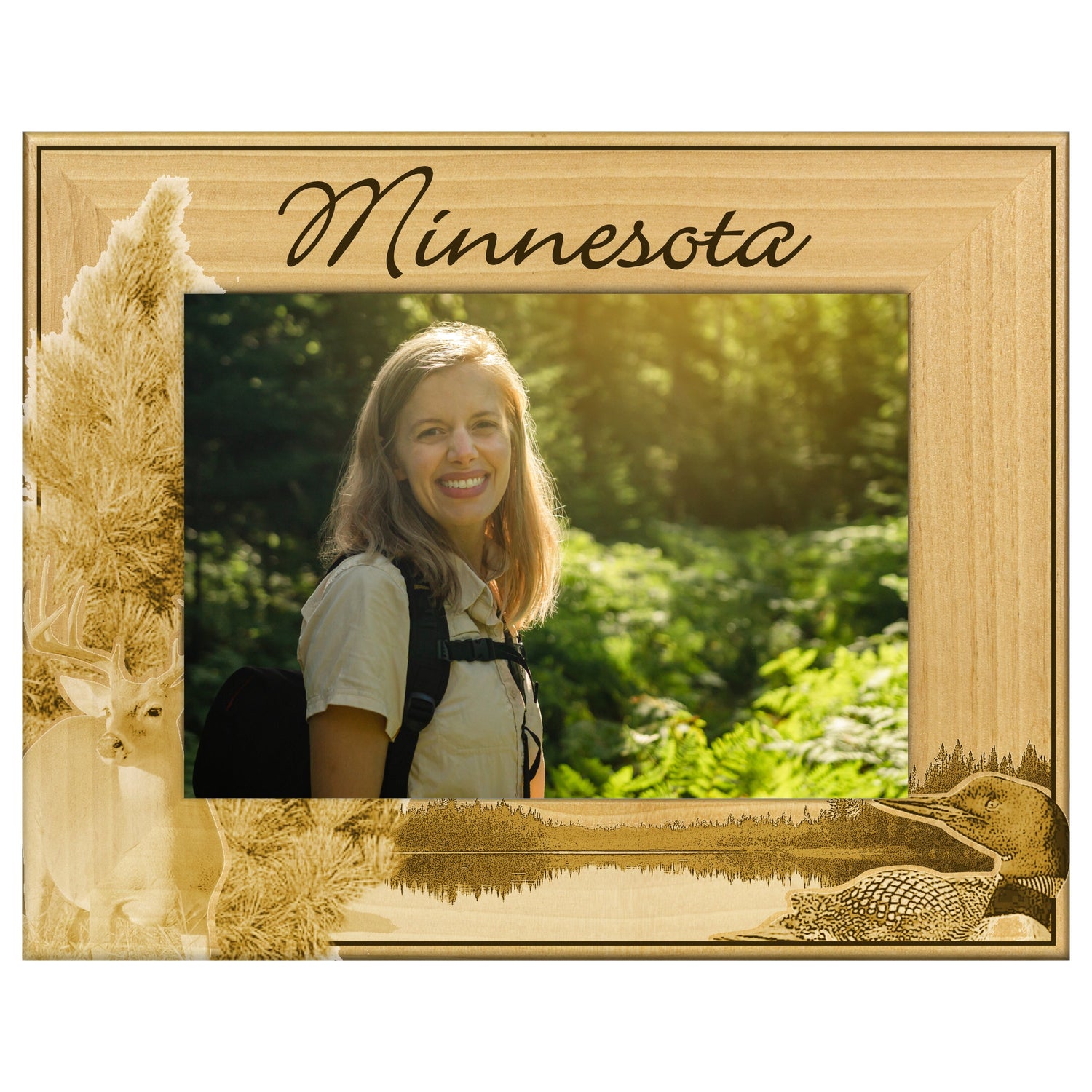 Capture the beauty of Minnesota's wilderness with our Minnesota Wildlife engraved wooden picture frame. This frame features intricate engravings of iconic wildlife, making it a perfect addition to your home or cabin.