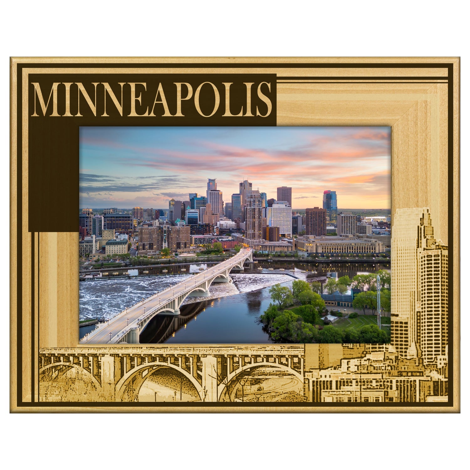 Capture the essence of Minnesota with our stunning Skyline Reverse Engraved Wooden Picture Frame. This unique frame showcases a beautifully detailed silhouette of the iconic Minnesota skyline, making it the perfect backdrop for your cherished memories.