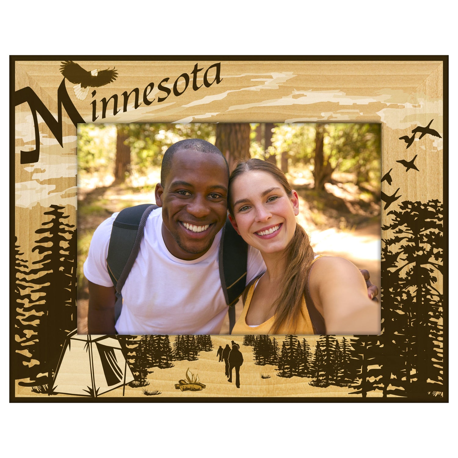 Capture your favorite camping memories with our Minnesota Camping engraved wooden picture frame. This frame features a beautifully engraved design that celebrates the great outdoors, making it the perfect addition to your home or cabin.