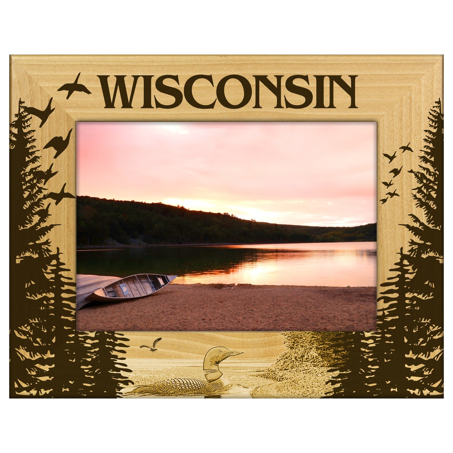 Capture your cherished memories with our Wisconsin Loon engraved wooden picture frame, a perfect blend of rustic charm and artistic elegance. This frame features a beautifully detailed loon design that pays homage to Wisconsin's stunning natural beauty.