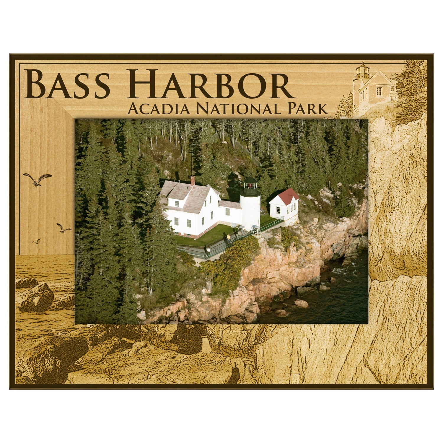 Capture your cherished memories with our Bass Harbor, Maine engraved wooden picture frame. This frame features a beautifully engraved design that pays homage to the stunning coastal charm of Bass Harbor.