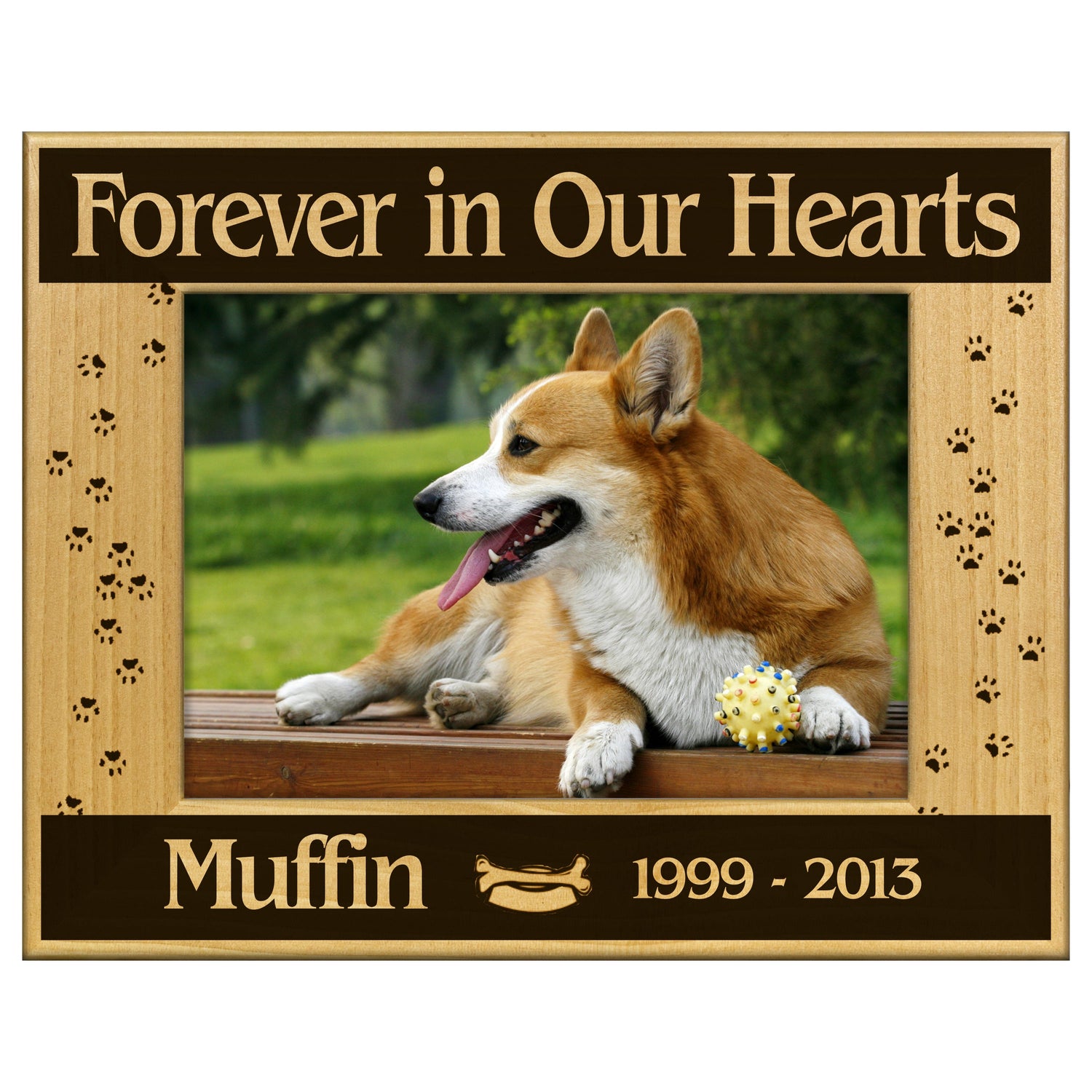 Celebrate the cherished memories of your beloved pet with our "Forever in Our Hearts" engraved wooden picture frame. This frame beautifully showcases your favorite photo while the heartfelt engraving serves as a touching tribute to the love you shared. Perfect for any home, it adds a personal touch to your decor and keeps your furry friend close to your heart.