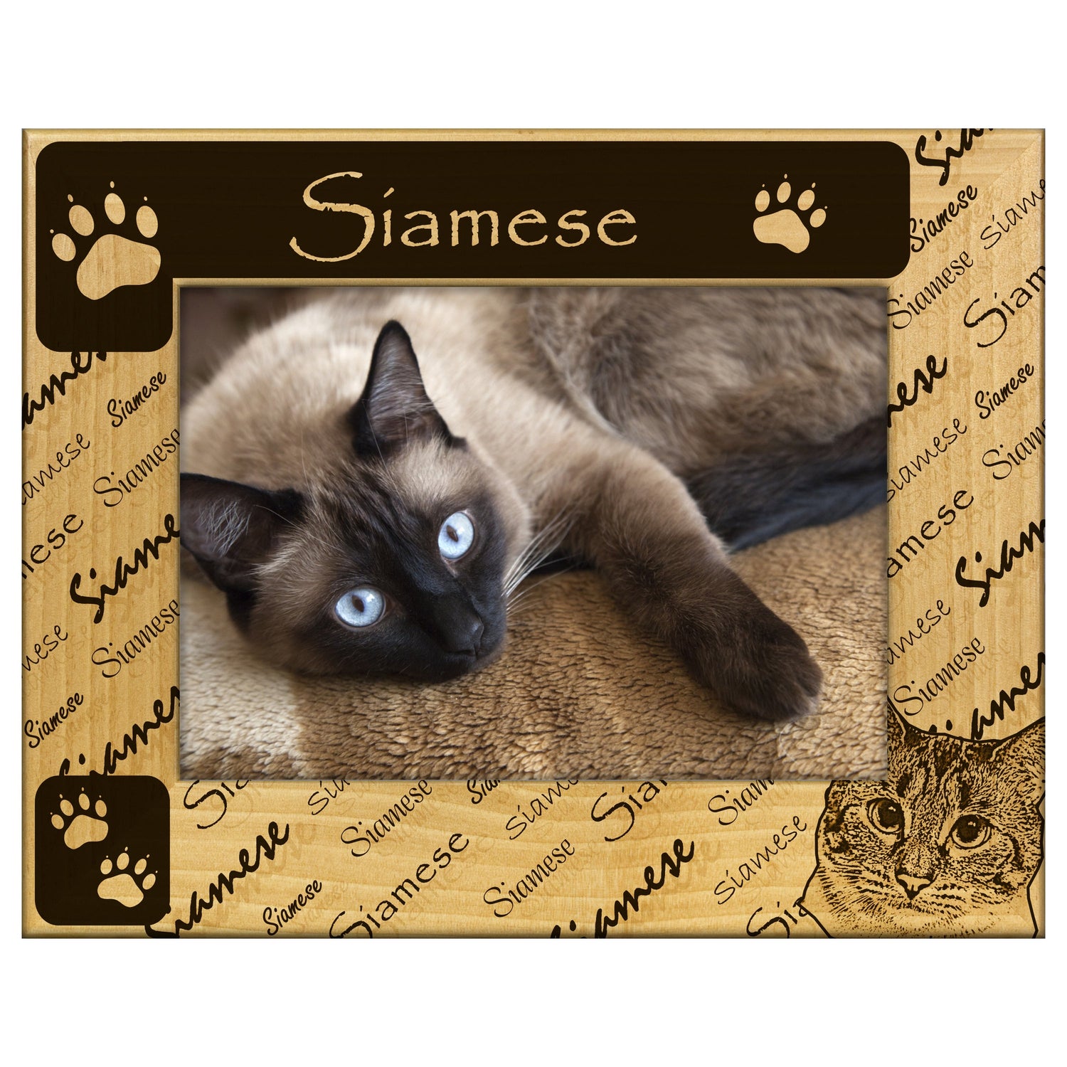 Showcase your love for Siamese cats with this beautifully engraved wooden picture frame. It features an intricate design that perfectly captures the elegance of these beloved felines. Ideal for displaying your favorite photos, this frame adds a touch of charm to any room while making a thoughtful gift for cat lovers.
