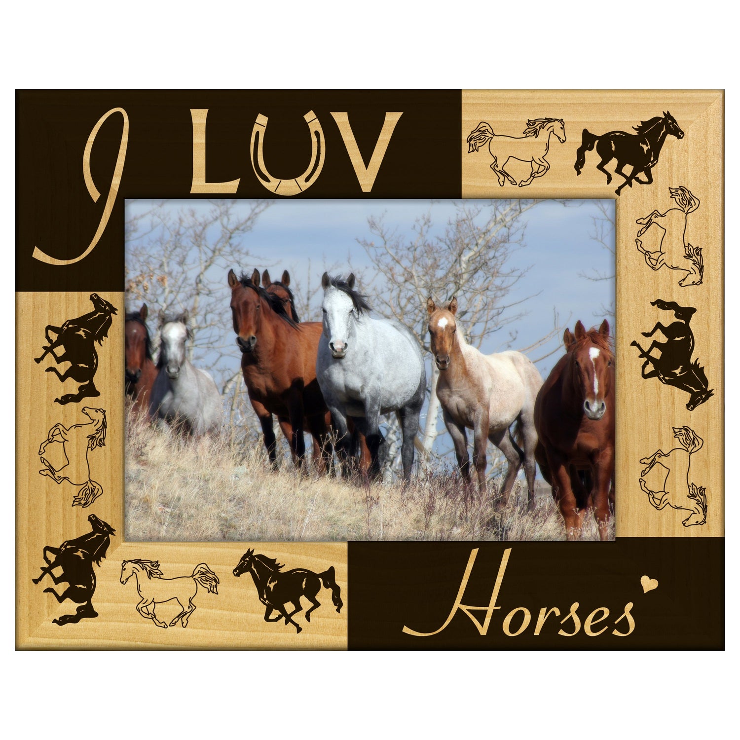Capture your cherished memories with our I Love Horses engraved wooden picture frame. This beautifully designed frame features a heartfelt engraving that celebrates your passion for horses.