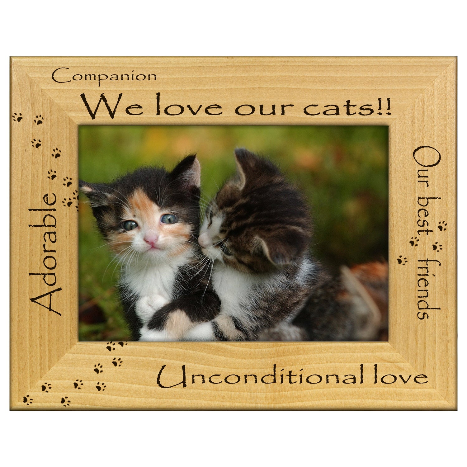 Celebrate your love for your feline friends with our We Love Our Cats engraved wooden picture frame. This charming frame adds a warm, rustic touch to any home decor while showcasing your favorite cat photos.