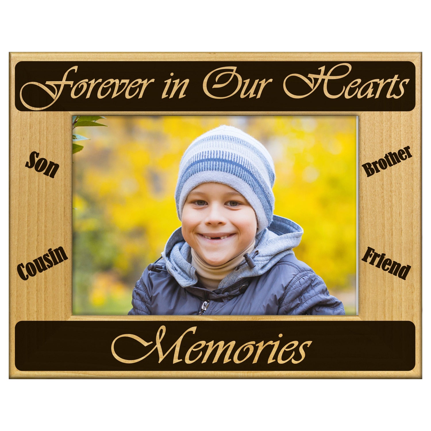 Celebrate cherished memories with our Forever in Our Hearts engraved wooden picture frame. This frame beautifully showcases your favorite photos while adding a heartfelt touch to any space.