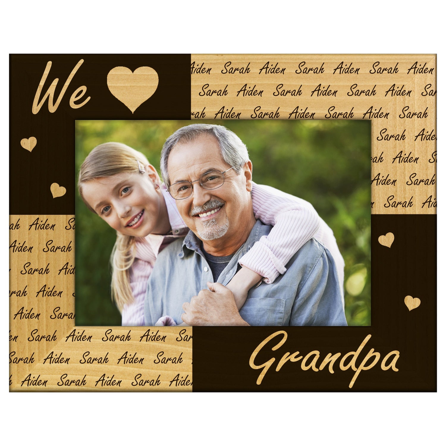 Celebrate the special bond with Grandpa using our We Heart Grandpa engraved wooden picture frame. This charming frame features a heartfelt design with names that adds a personal touch to any space.