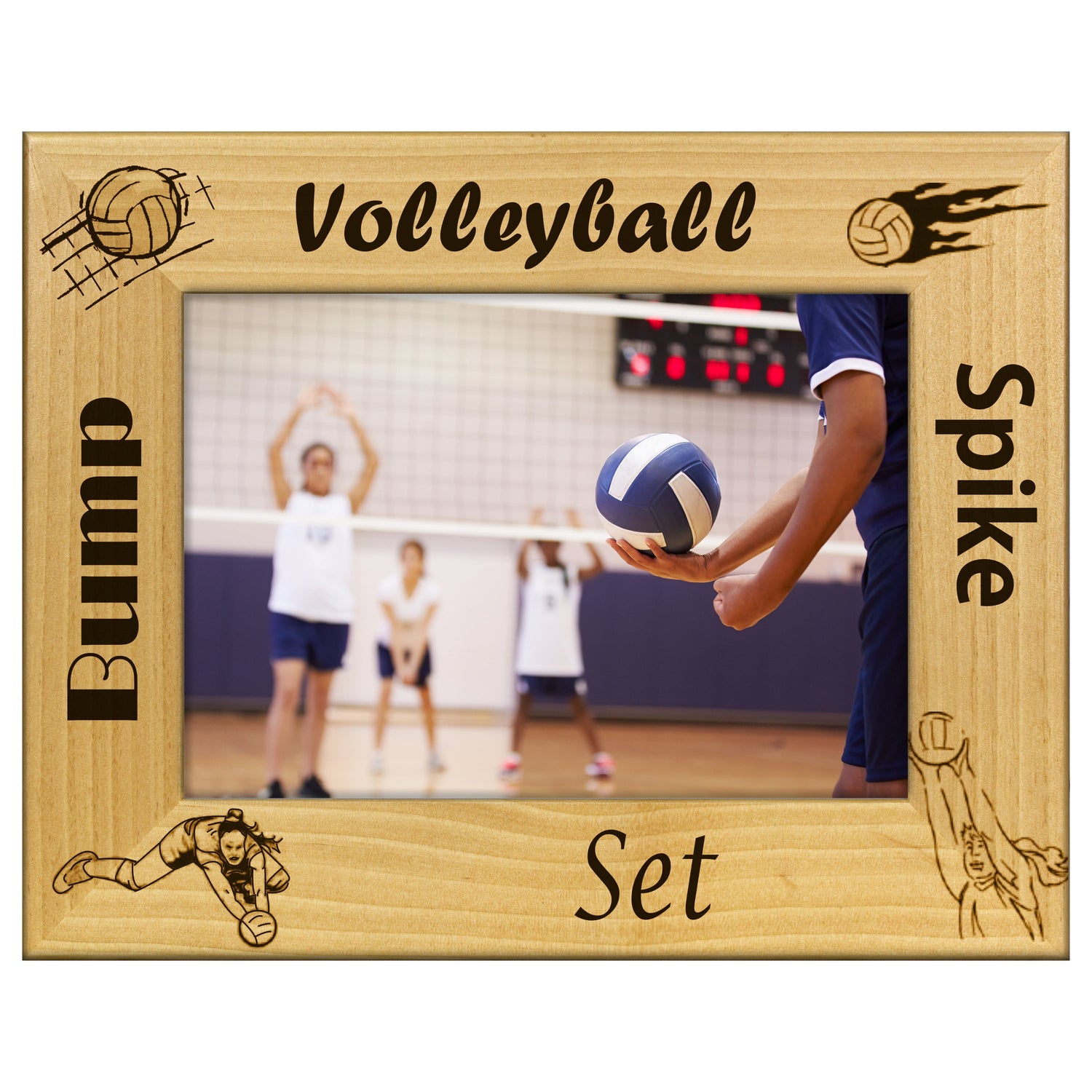 Capture your favorite volleyball moments with our beautifully engraved wooden picture frame. This frame features a unique volleyball design that adds a sporty touch to any space. Perfect for displaying team photos, action shots, or cherished memories.
