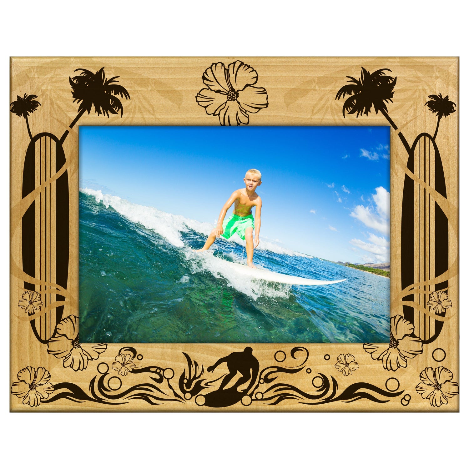 Capture your favorite surfing memories with our Surfing Icons Engraved Wooden Picture Frame. This frame features beautifully engraved surfing motifs that add a touch of coastal charm to any space.