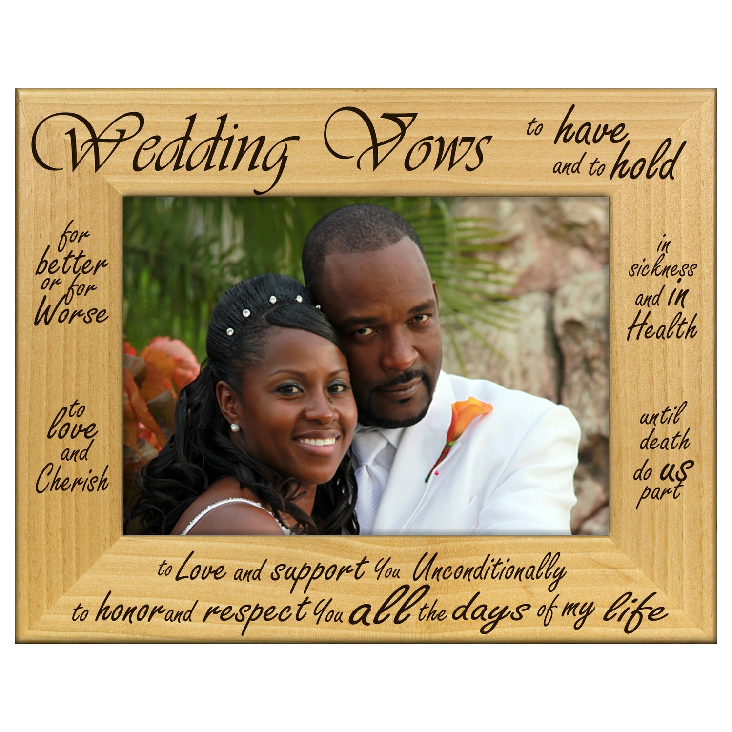 Capture the essence of your love story with our Wedding Vows Engraved Wooden Picture Frame. This beautifully crafted frame not only showcases your favorite photo but also features your heartfelt vows elegantly engraved, making it a timeless keepsake for your special day.