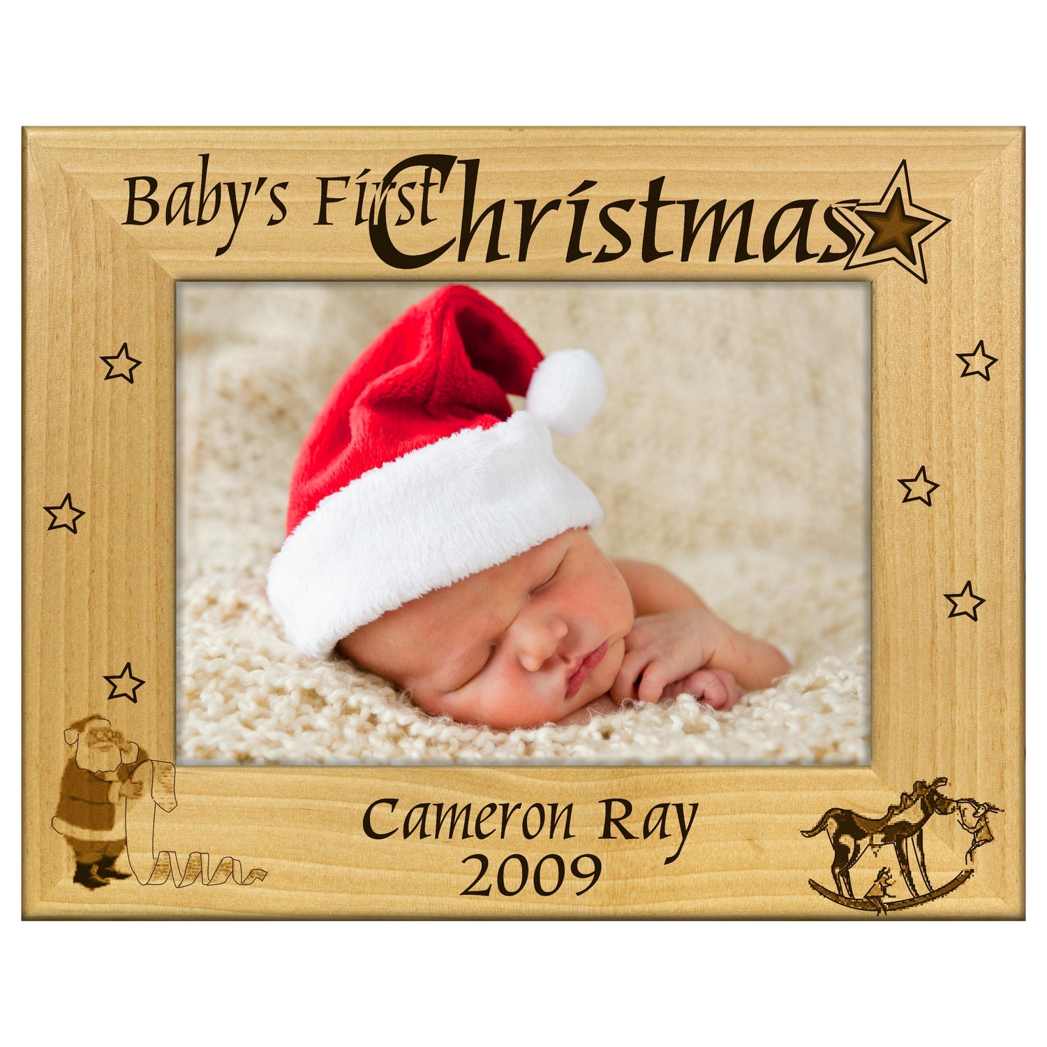 Capture the magic of your baby's first Christmas with our beautifully engraved wooden picture frame. This charming frame not only showcases your favorite holiday photo, but also features a heartfelt engraving that makes it a perfect keepsake for years to come.