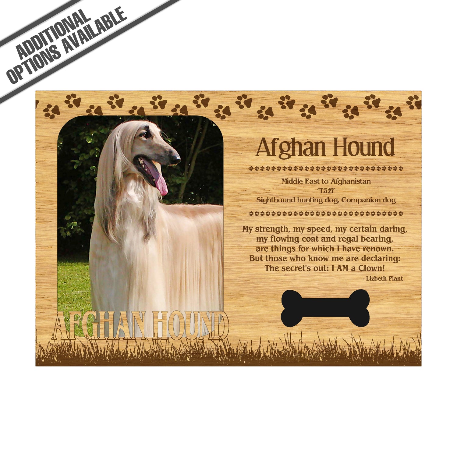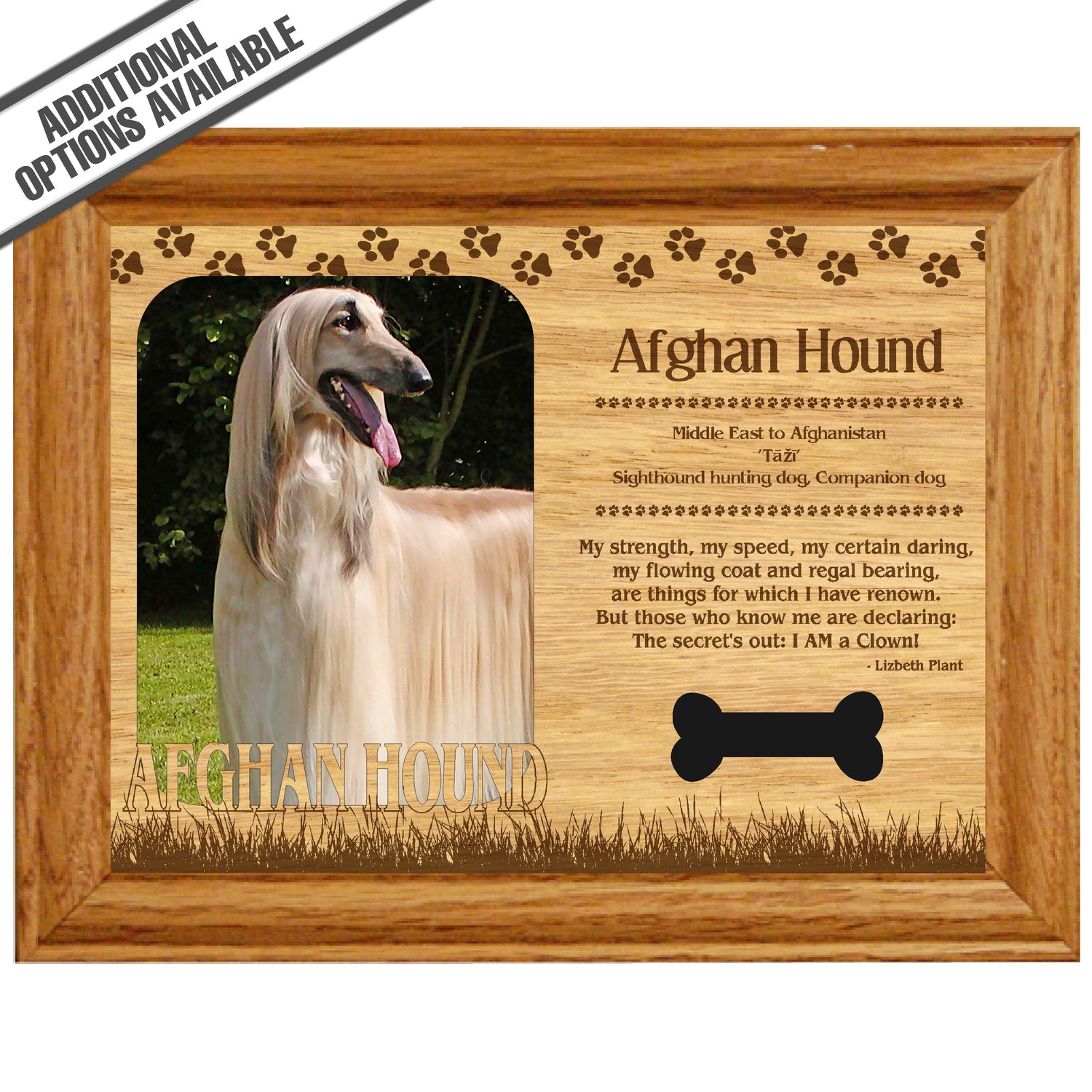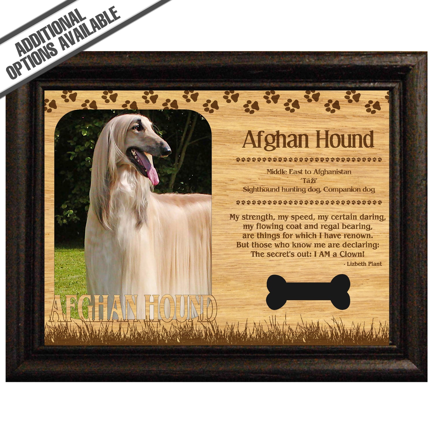 Celebrate the unique bond between you and your dog with our exquisite " Afghan Hound" wooden photo frame. This beautifully crafted wooden frame showcases engraved paw print, capturing the essence of your furry friend in a stylish and heartwarming way. Perfect for displaying your favorite photo, this frame not only serves as a cherished keepsake but also highlights the playful and loyal personality traits of the Afghan Hound. A thoughtful gift for dog lovers, it adds a personal touch to any home decor while honoring the love and companionship of your pet. Our FrameWorks magnetic mattes are the best way to accentuate any picture. Prefect for a fridge, locker, file cabinet and more, with a strong magnetic backing. Our FrameWorks material is lightweight making it a great souvenir to pack or mail.