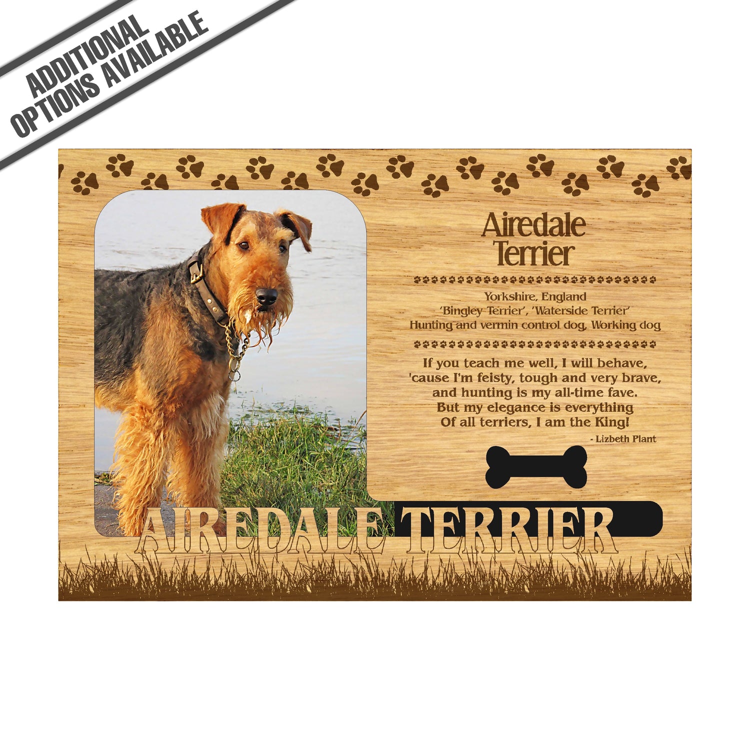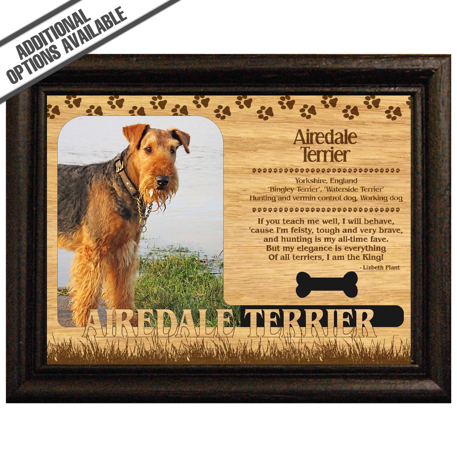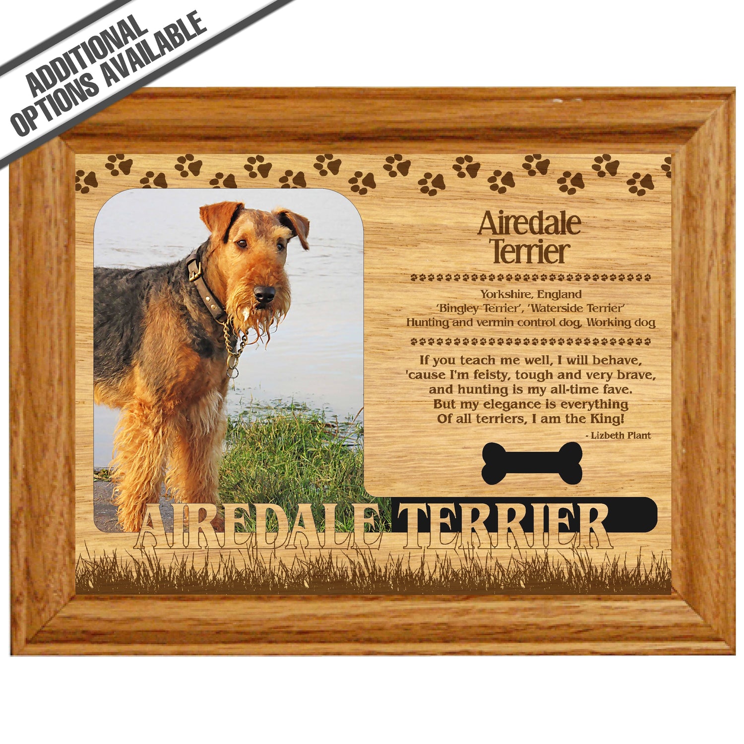 Celebrate the unique bond between you and your dog with our exquisite " Airedale Terrier" wooden photo frame. This beautifully crafted wooden frame showcases engraved paw print, capturing the essence of your furry friend in a stylish and heartwarming way. Perfect for displaying your favorite photo, this frame not only serves as a cherished keepsake but also highlights the playful and loyal personality traits of the Airedale Terrier. A thoughtful gift for dog lovers, it adds a personal touch to any home decor while honoring the love and companionship of your pet. Our FrameWorks magnetic mattes are the best way to accentuate any picture. Prefect for a fridge, locker, file cabinet and more, with a strong magnetic backing. Our FrameWorks material is lightweight making it a great souvenir to pack or mail.