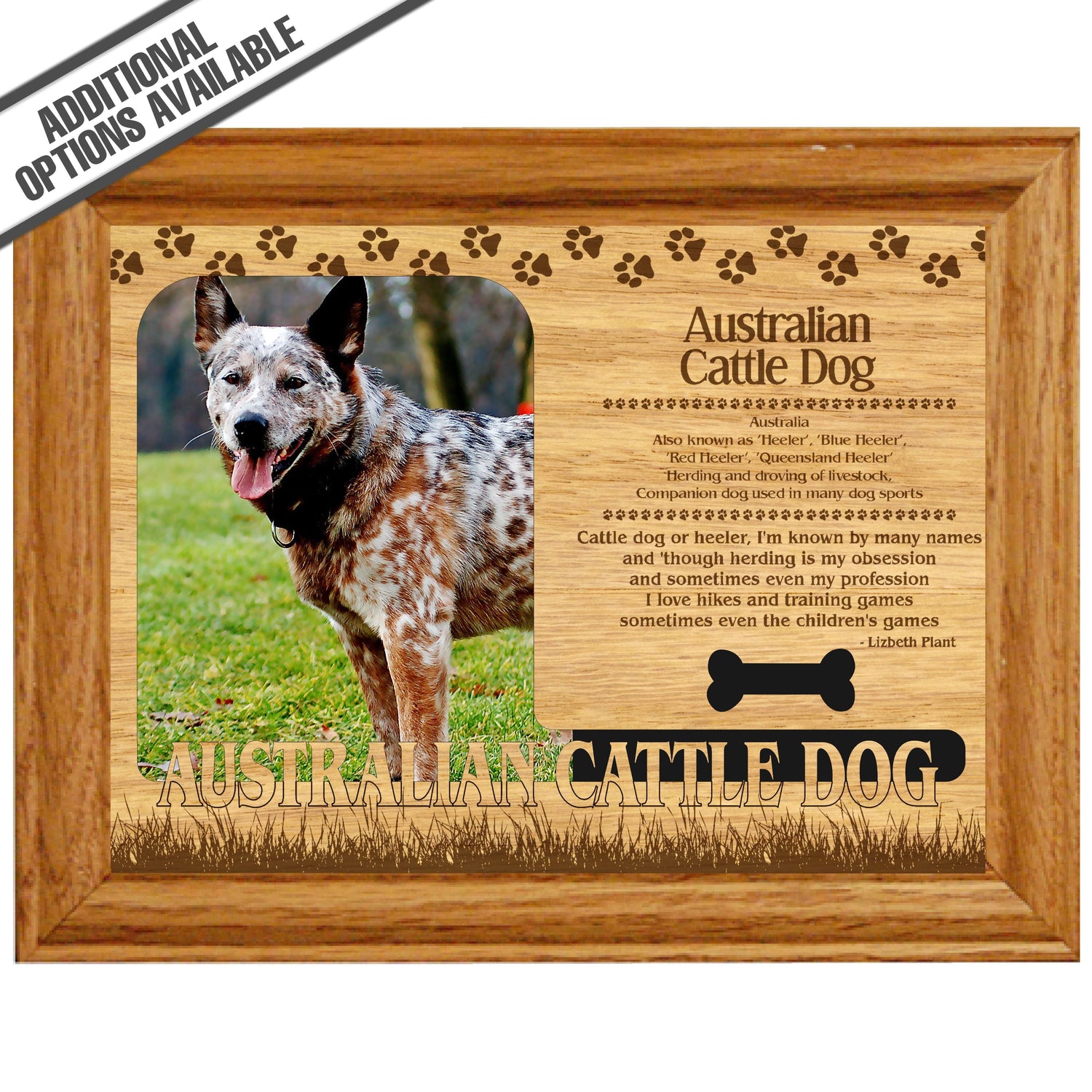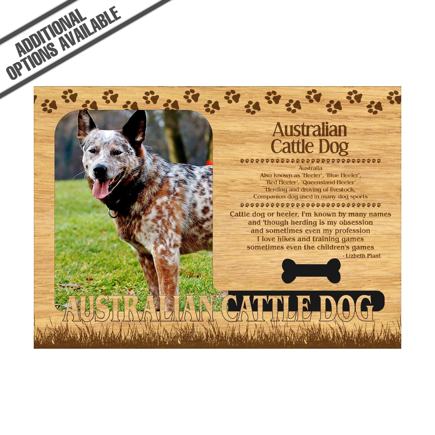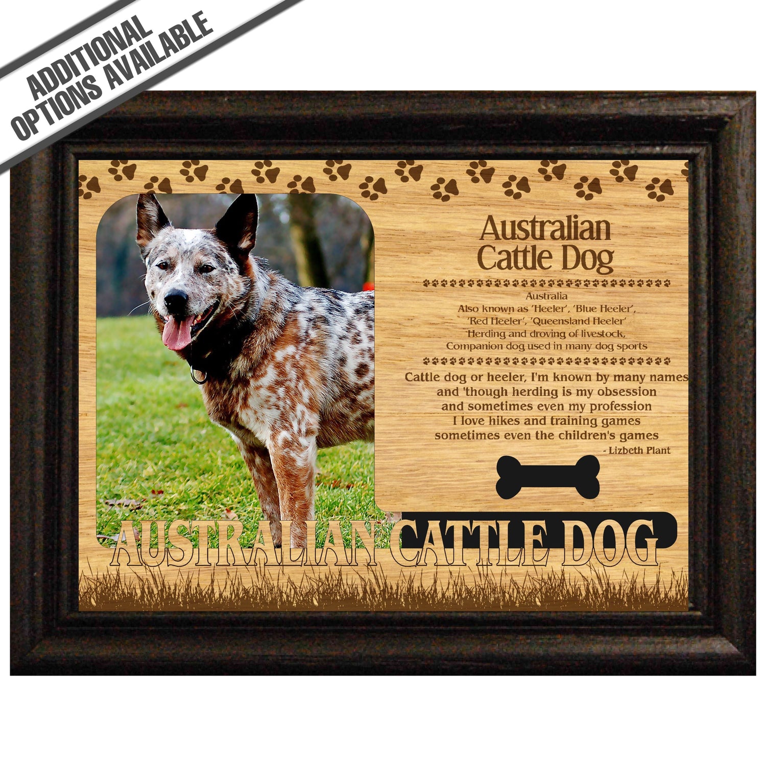 Celebrate the unique bond between you and your dog with our exquisite "Australian Cattle Dog" wooden photo frame. This beautifully crafted wooden frame showcases engraved paw print, capturing the essence of your furry friend in a stylish and heartwarming way. Perfect for displaying your favorite photo, this frame not only serves as a cherished keepsake but also highlights the playful and loyal personality traits of the Australian Cattle Dog. A thoughtful gift for dog lovers, it adds a personal touch to any home decor while honoring the love and companionship of your pet. Our FrameWorks magnetic mattes are the best way to accentuate any picture. Prefect for a fridge, locker, file cabinet and more, with a strong magnetic backing. Our FrameWorks material is lightweight making it a great souvenir to pack or mail.