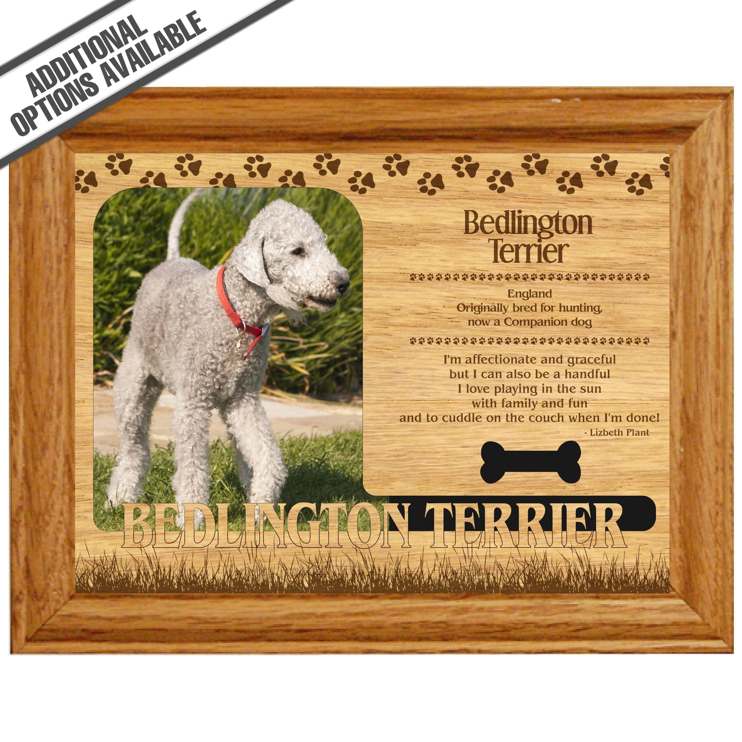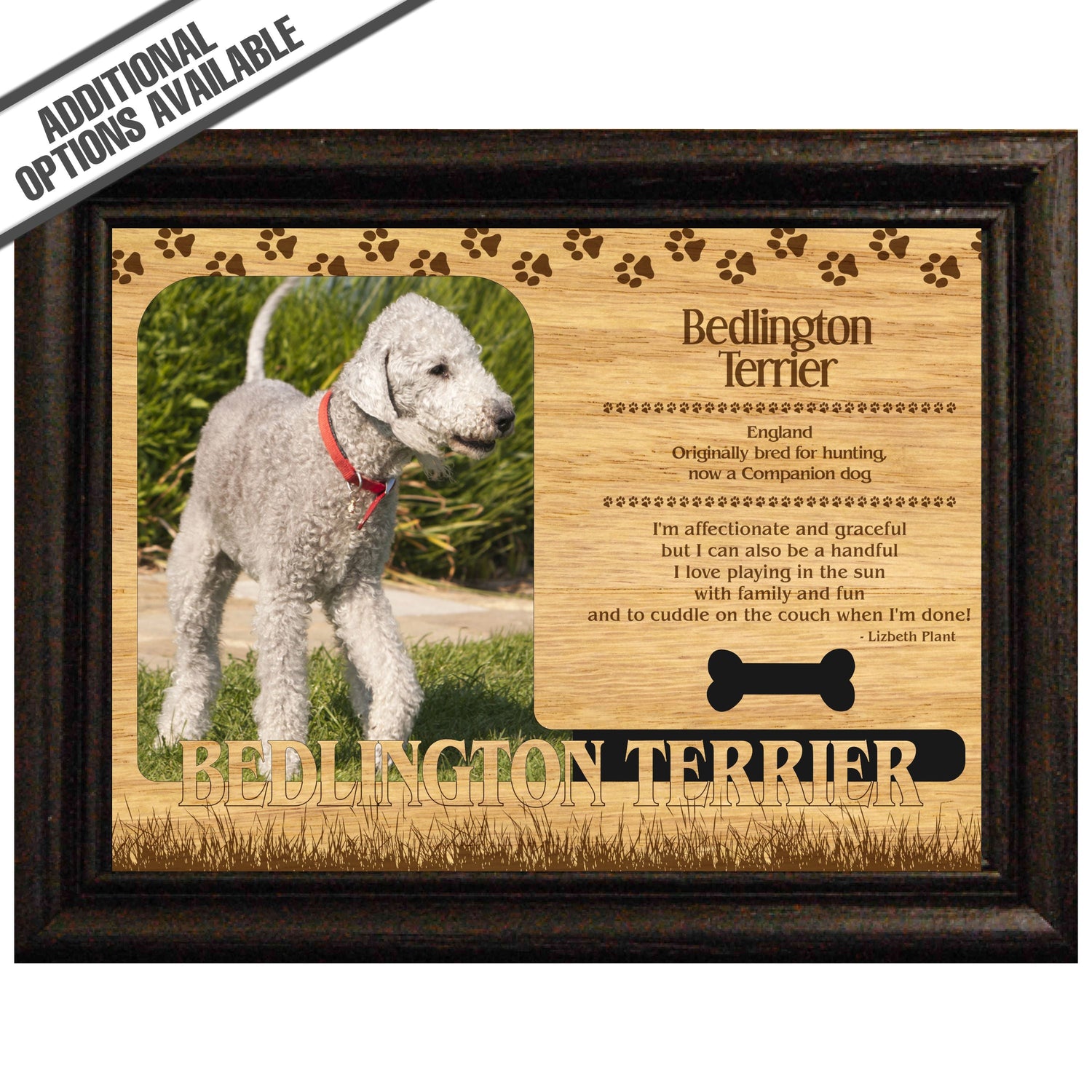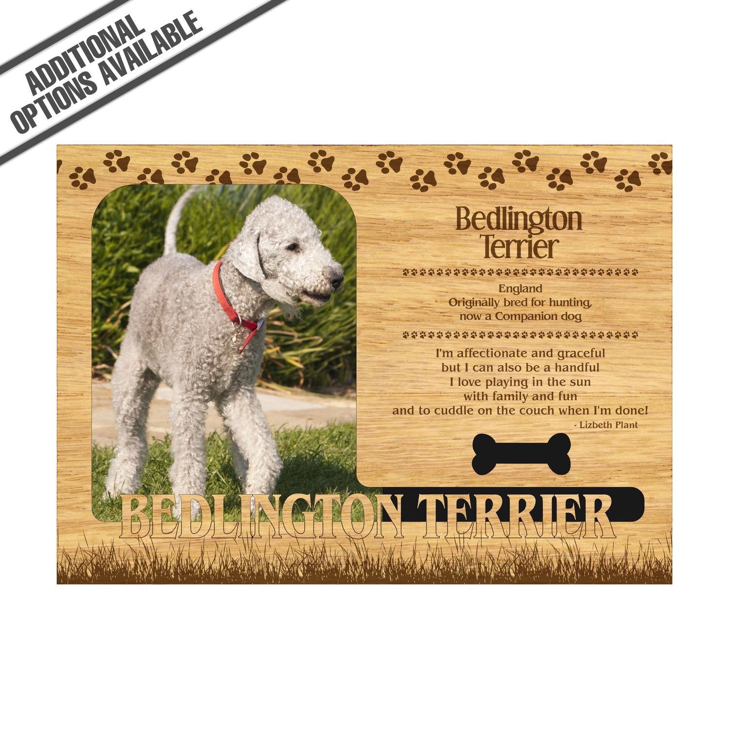 Celebrate the unique bond between you and your dog with our exquisite "Bedlington Terrier" wooden photo frame. This beautifully crafted wooden frame showcases engraved paw print, capturing the essence of your furry friend in a stylish and heartwarming way. Perfect for displaying your favorite photo, this frame not only serves as a cherished keepsake but also highlights the playful and loyal personality traits of the Bedlington Terrier. A thoughtful gift for dog lovers, it adds a personal touch to any home decor while honoring the love and companionship of your pet. Our FrameWorks magnetic mattes are the best way to accentuate any picture. Prefect for a fridge, locker, file cabinet and more, with a strong magnetic backing. Our FrameWorks material is lightweight making it a great souvenir to pack or mail.
