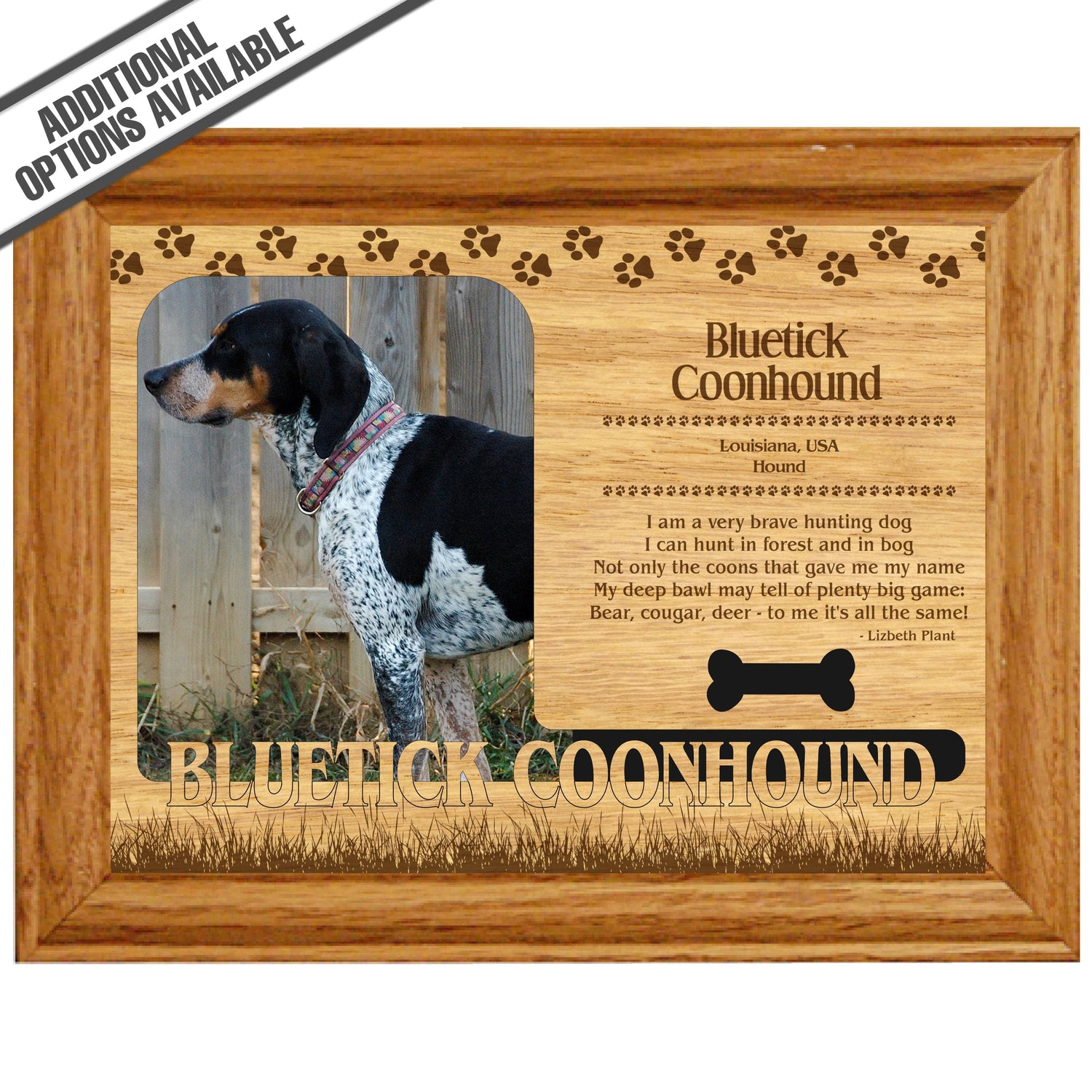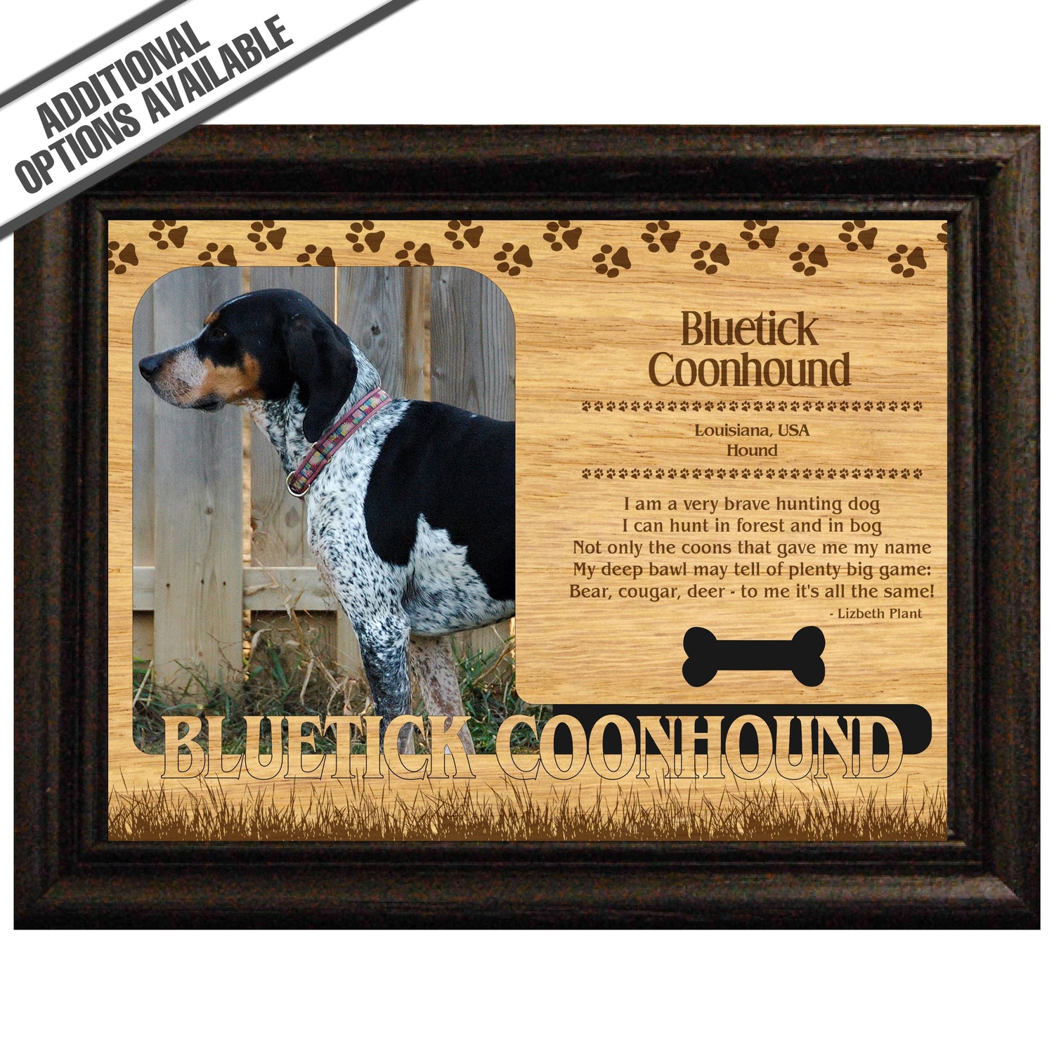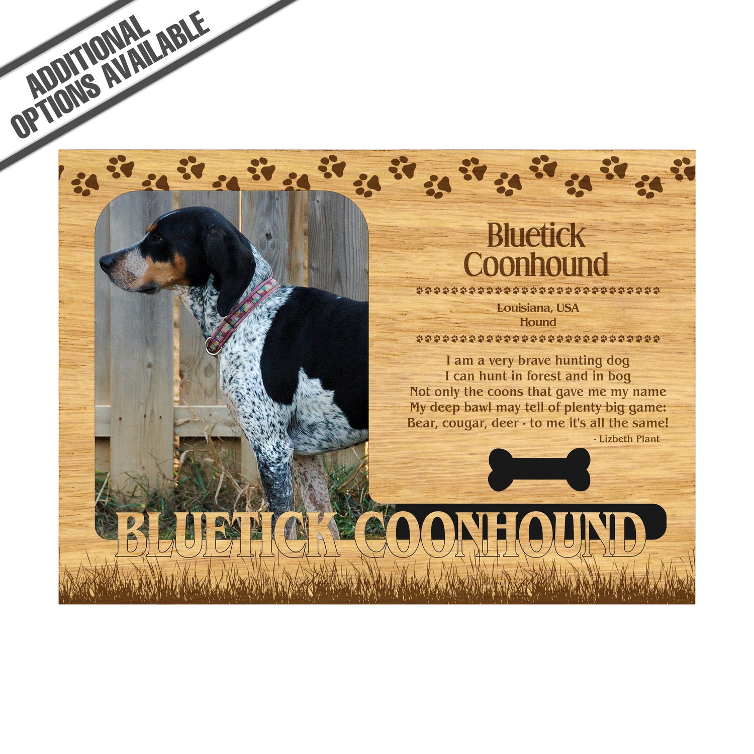 Celebrate the unique bond between you and your dog with our exquisite "Bluetick Coonhound" wooden photo frame. This beautifully crafted wooden frame showcases engraved paw print, capturing the essence of your furry friend in a stylish and heartwarming way. Perfect for displaying your favorite photo, this frame not only serves as a cherished keepsake but also highlights the playful and loyal personality traits of the Bluetick Coonhound. A thoughtful gift for dog lovers, it adds a personal touch to any home decor while honoring the love and companionship of your pet. Our FrameWorks magnetic mattes are the best way to accentuate any picture. Prefect for a fridge, locker, file cabinet and more, with a strong magnetic backing. Our FrameWorks material is lightweight making it a great souvenir to pack or mail.
