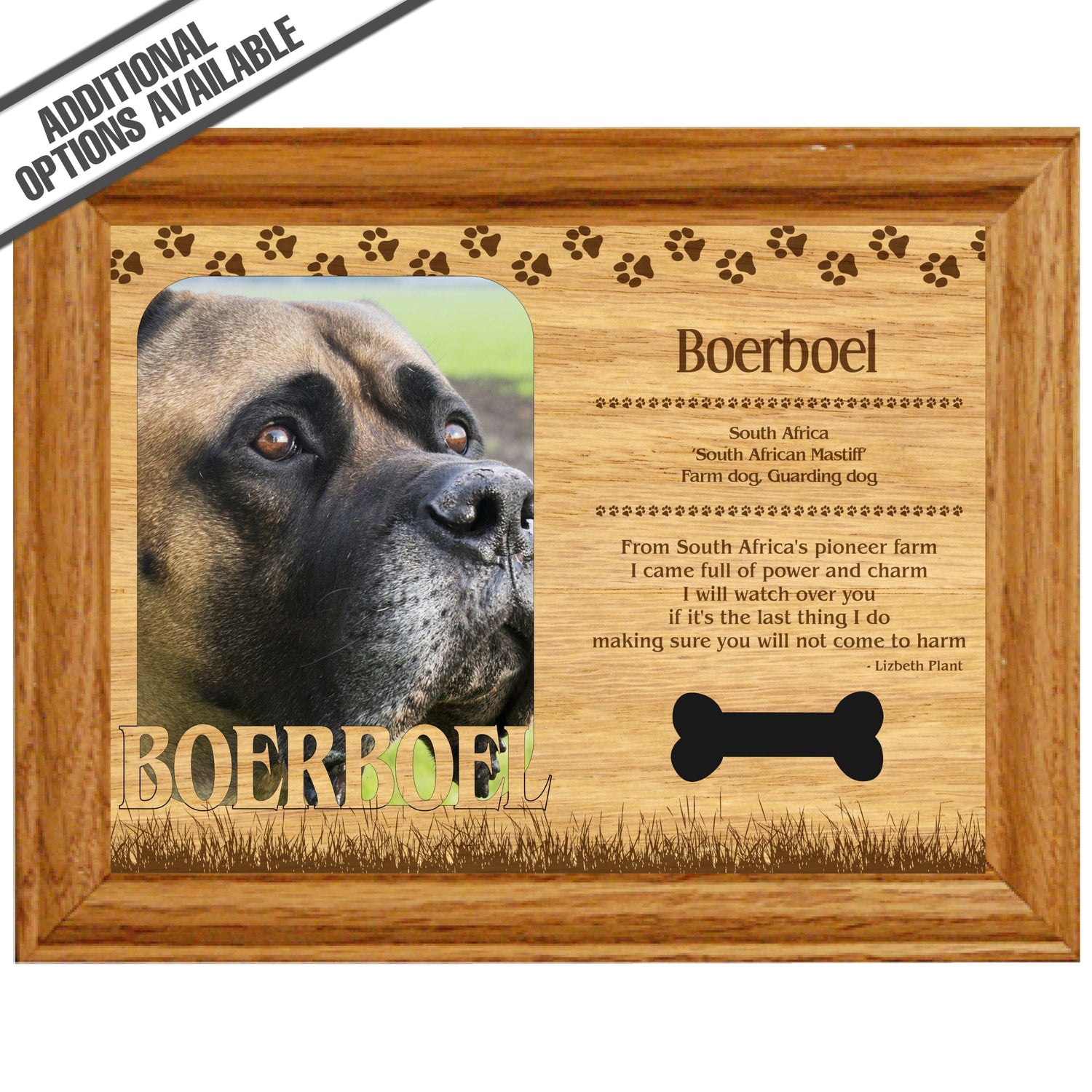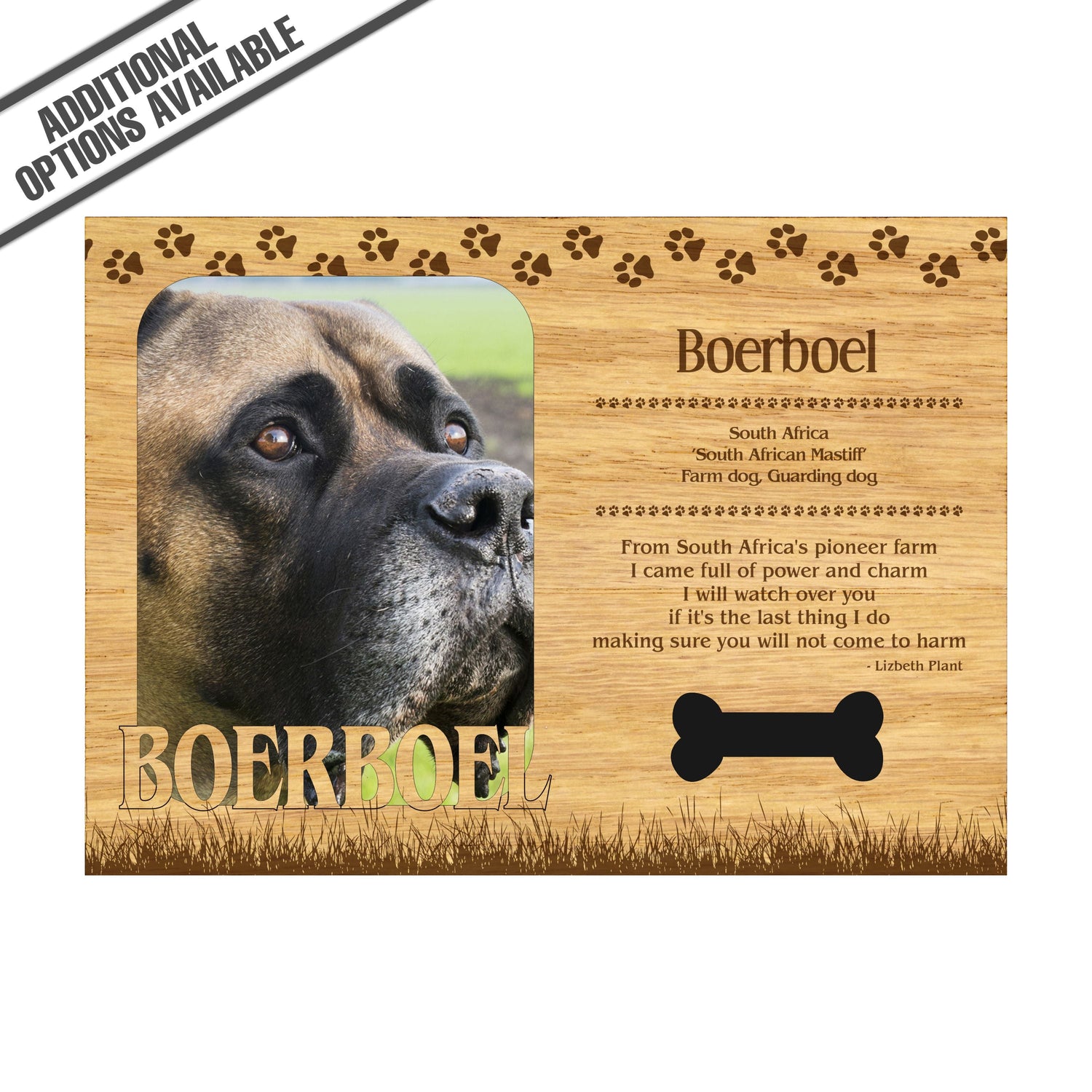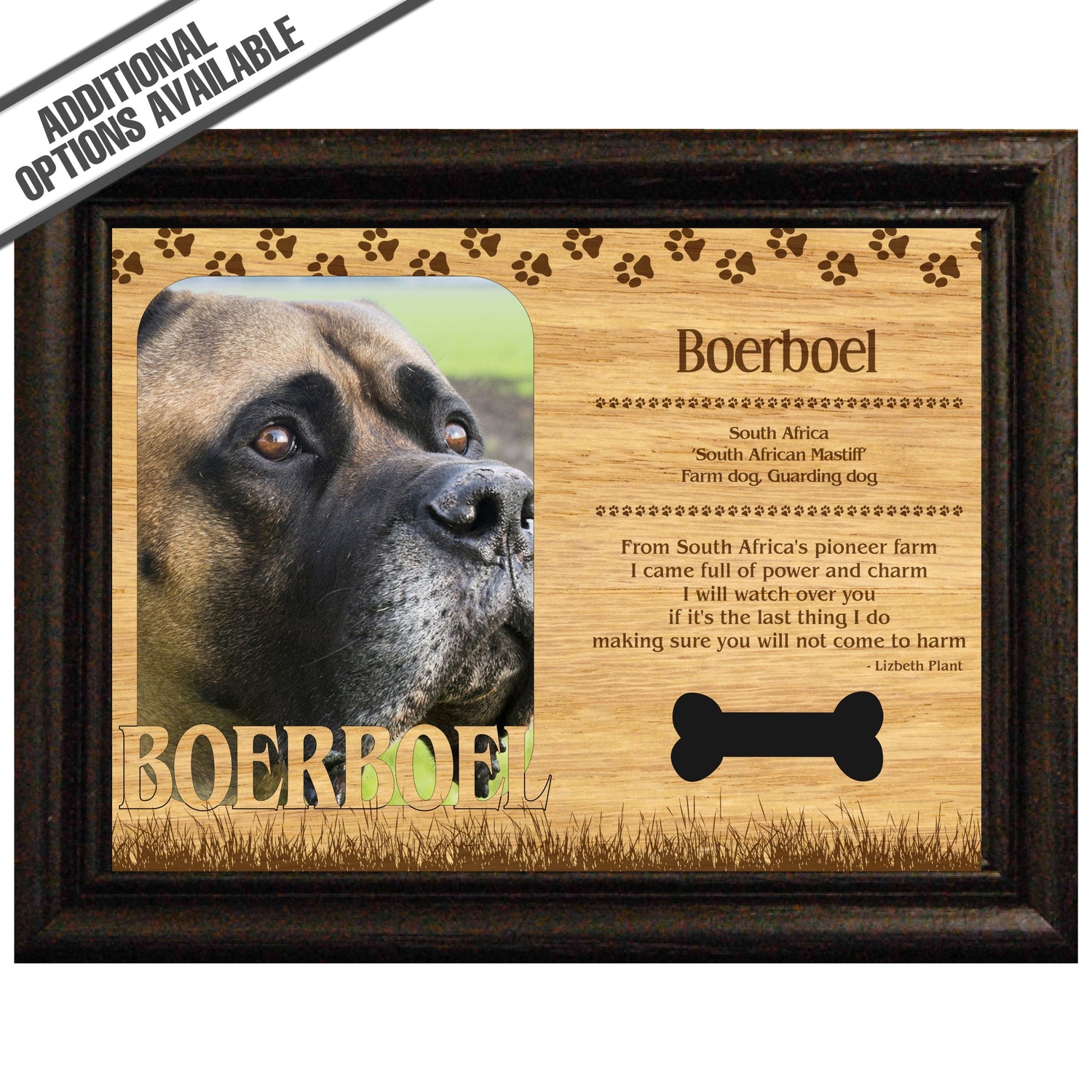 Celebrate the unique bond between you and your dog with our exquisite "Boerboel" wooden photo frame. This beautifully crafted wooden frame showcases engraved paw print, capturing the essence of your furry friend in a stylish and heartwarming way. Perfect for displaying your favorite photo, this frame not only serves as a cherished keepsake but also highlights the playful and loyal personality traits of the Boerboel. A thoughtful gift for dog lovers, it adds a personal touch to any home decor while honoring the love and companionship of your pet. Our FrameWorks magnetic mattes are the best way to accentuate any picture. Prefect for a fridge, locker, file cabinet and more, with a strong magnetic backing. Our FrameWorks material is lightweight making it a great souvenir to pack or mail.
