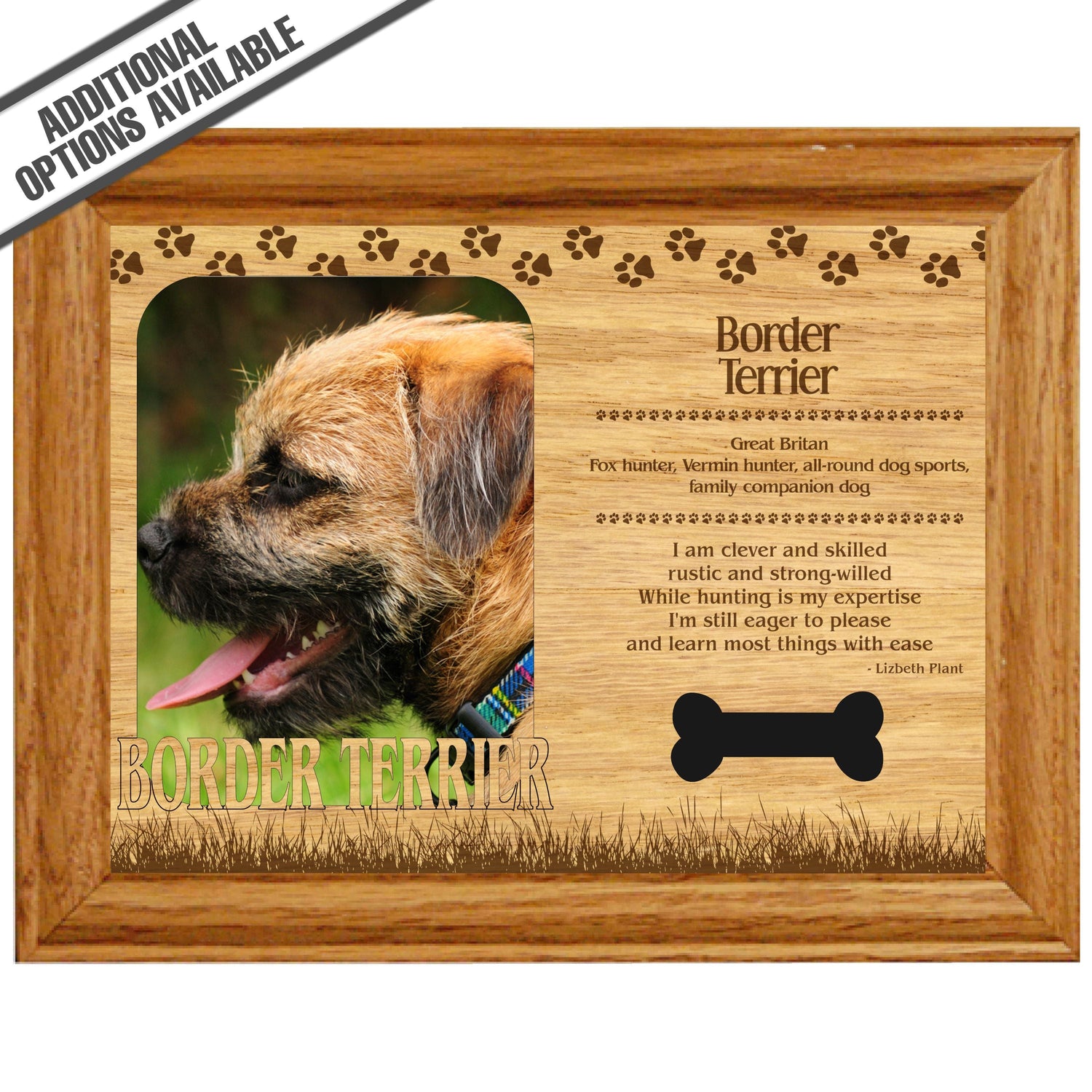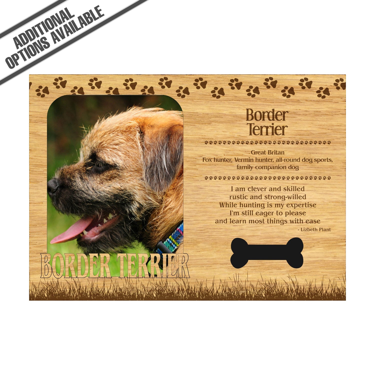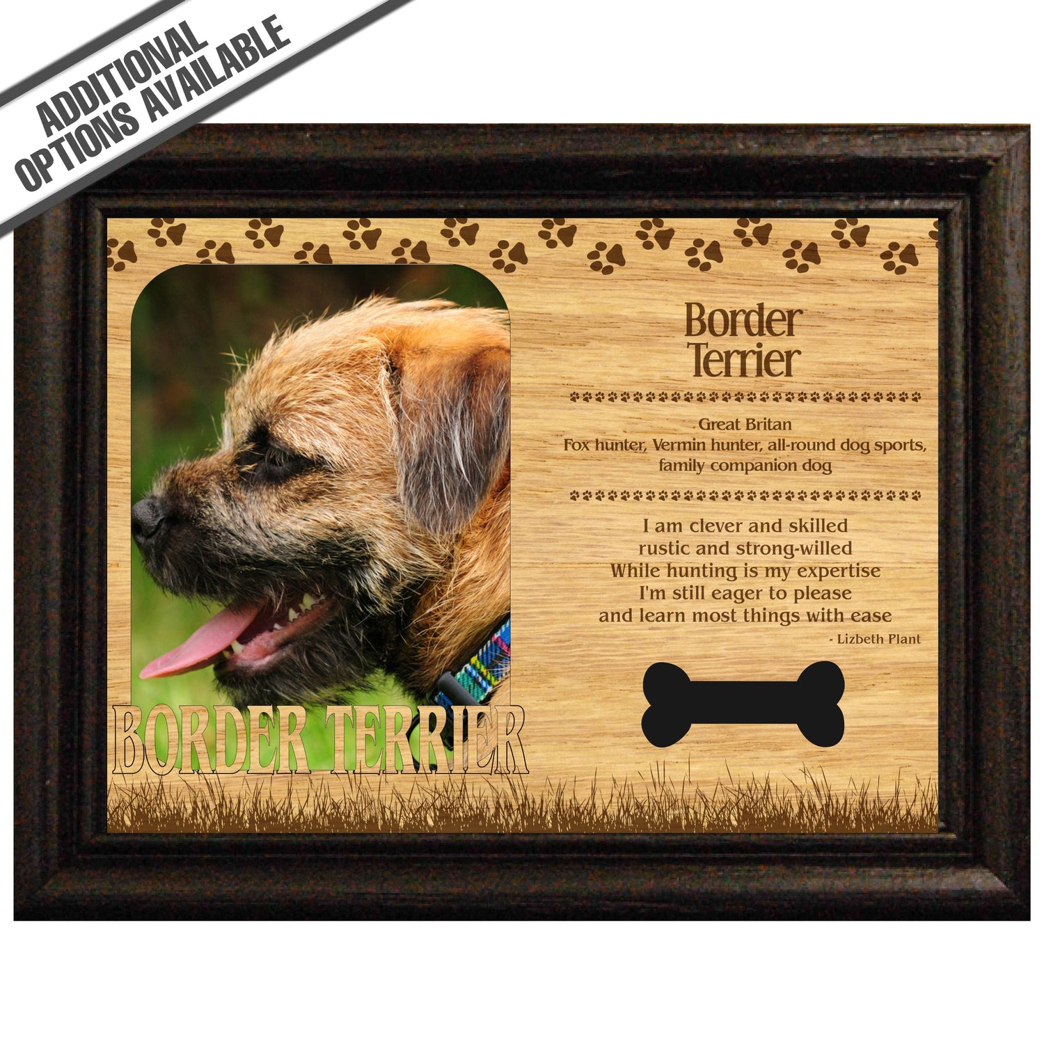 Celebrate the unique bond between you and your dog with our exquisite "Border Terrier" wooden photo frame. This beautifully crafted wooden frame showcases engraved paw print, capturing the essence of your furry friend in a stylish and heartwarming way. Perfect for displaying your favorite photo, this frame not only serves as a cherished keepsake but also highlights the playful and loyal personality traits of the Border Terrier. A thoughtful gift for dog lovers, it adds a personal touch to any home decor while honoring the love and companionship of your pet. Our FrameWorks magnetic mattes are the best way to accentuate any picture. Prefect for a fridge, locker, file cabinet and more, with a strong magnetic backing. Our FrameWorks material is lightweight making it a great souvenir to pack or mail.