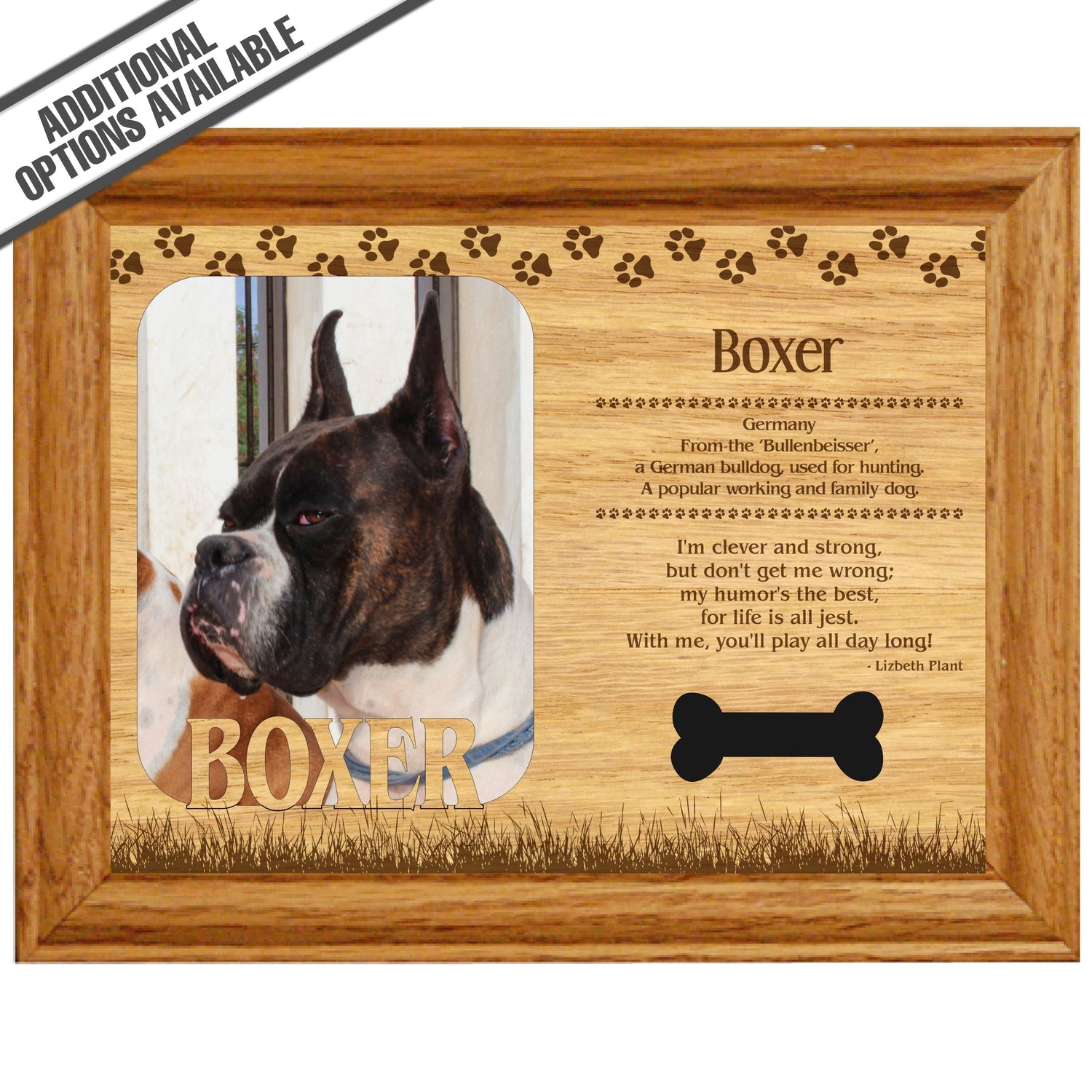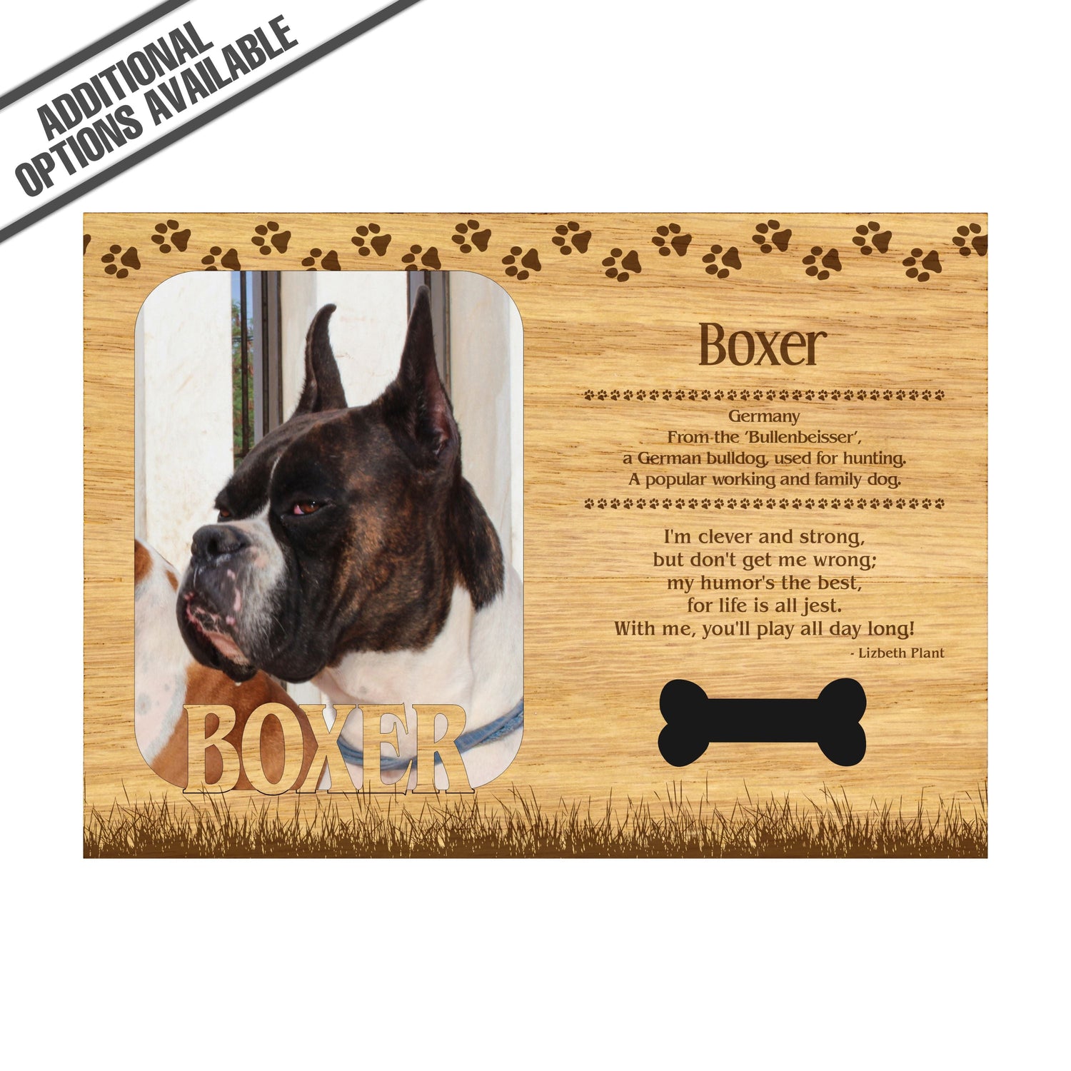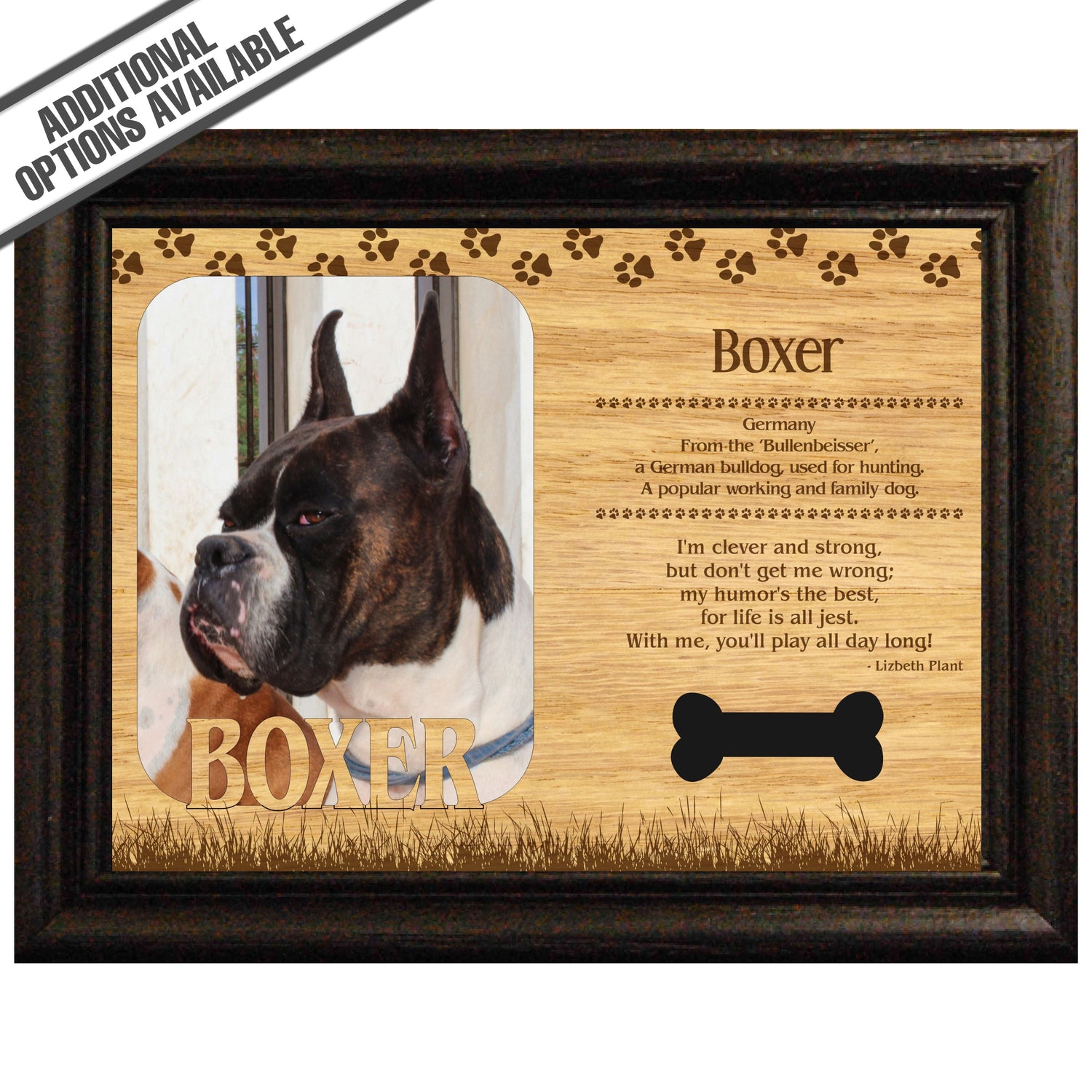 Celebrate the unique bond between you and your dog with our exquisite "Boxer" wooden photo frame. This beautifully crafted wooden frame showcases engraved paw print, capturing the essence of your furry friend in a stylish and heartwarming way. Perfect for displaying your favorite photo, this frame not only serves as a cherished keepsake but also highlights the playful and loyal personality traits of the Boxer. A thoughtful gift for dog lovers, it adds a personal touch to any home decor while honoring the love and companionship of your pet. Our FrameWorks magnetic mattes are the best way to accentuate any picture. Prefect for a fridge, locker, file cabinet and more, with a strong magnetic backing. Our FrameWorks material is lightweight making it a great souvenir to pack or mail.