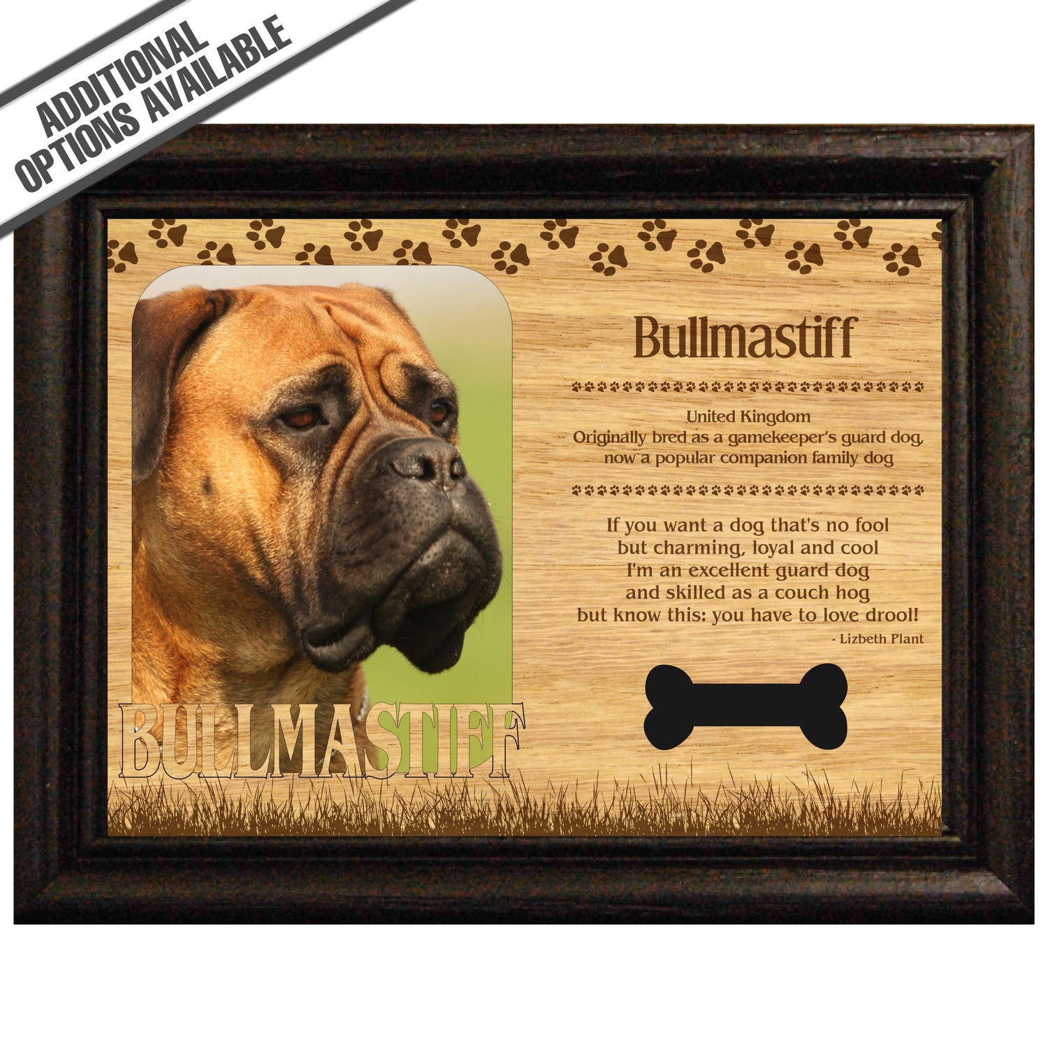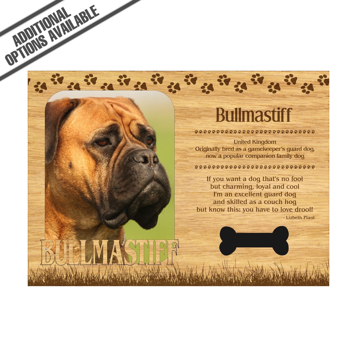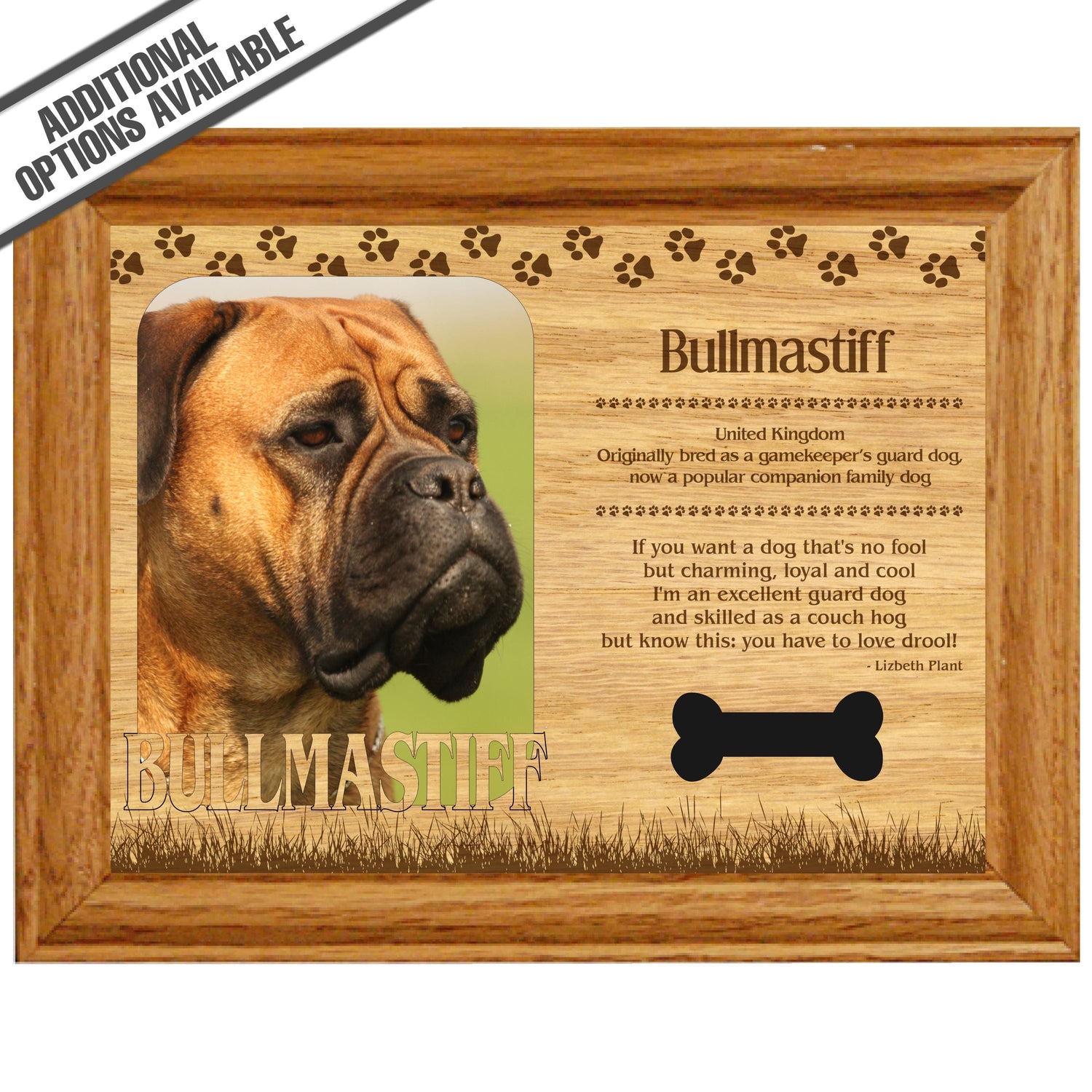 Celebrate the unique bond between you and your dog with our exquisite "Bullmastiff" wooden photo frame. This beautifully crafted wooden frame showcases engraved paw print, capturing the essence of your furry friend in a stylish and heartwarming way. Perfect for displaying your favorite photo, this frame not only serves as a cherished keepsake but also highlights the playful and loyal personality traits of the Bullmastiff. A thoughtful gift for dog lovers, it adds a personal touch to any home decor while honoring the love and companionship of your pet. Our FrameWorks magnetic mattes are the best way to accentuate any picture. Prefect for a fridge, locker, file cabinet and more, with a strong magnetic backing. Our FrameWorks material is lightweight making it a great souvenir to pack or mail.