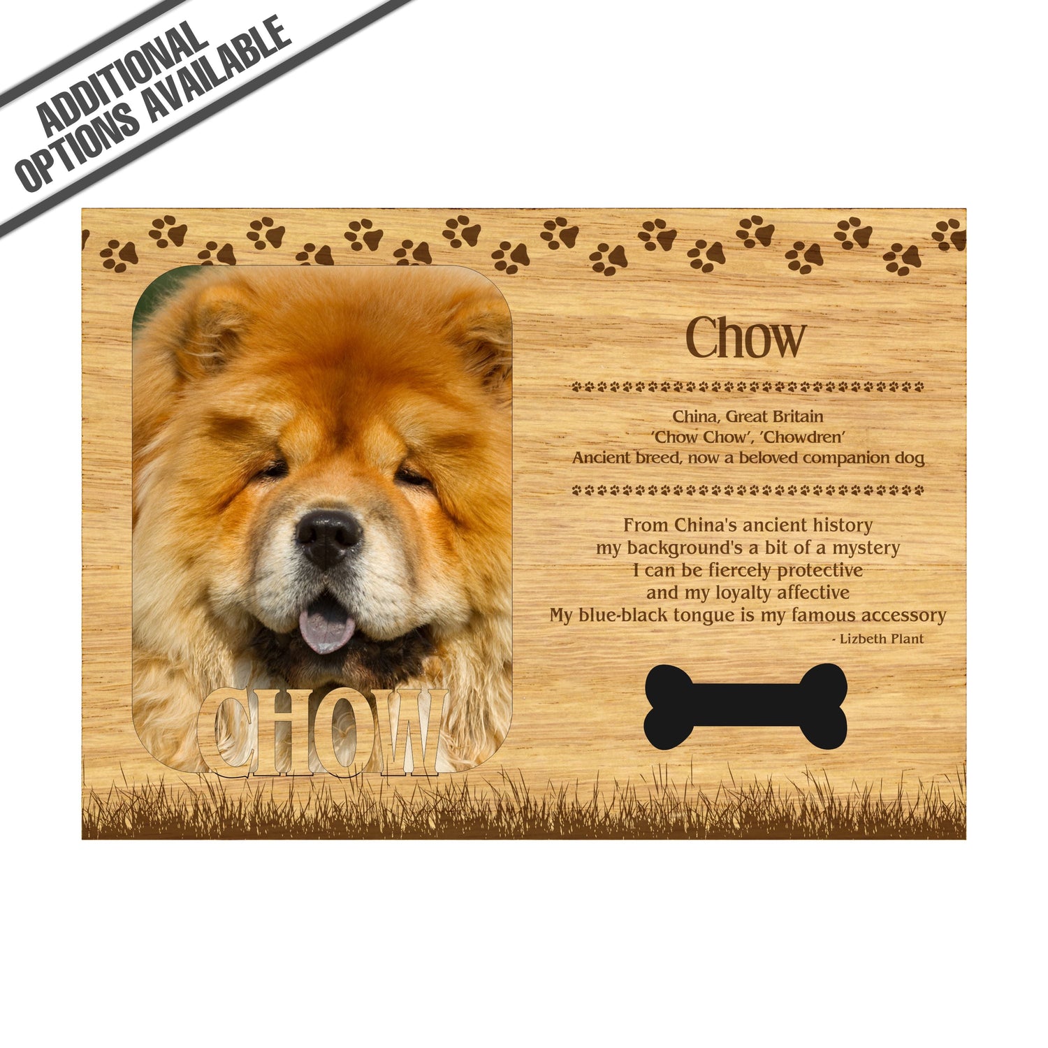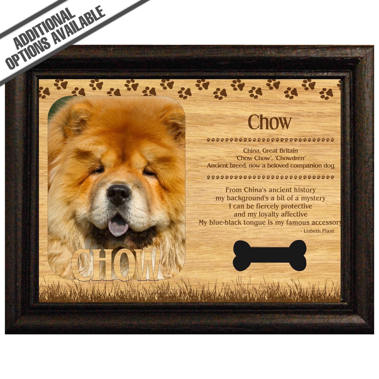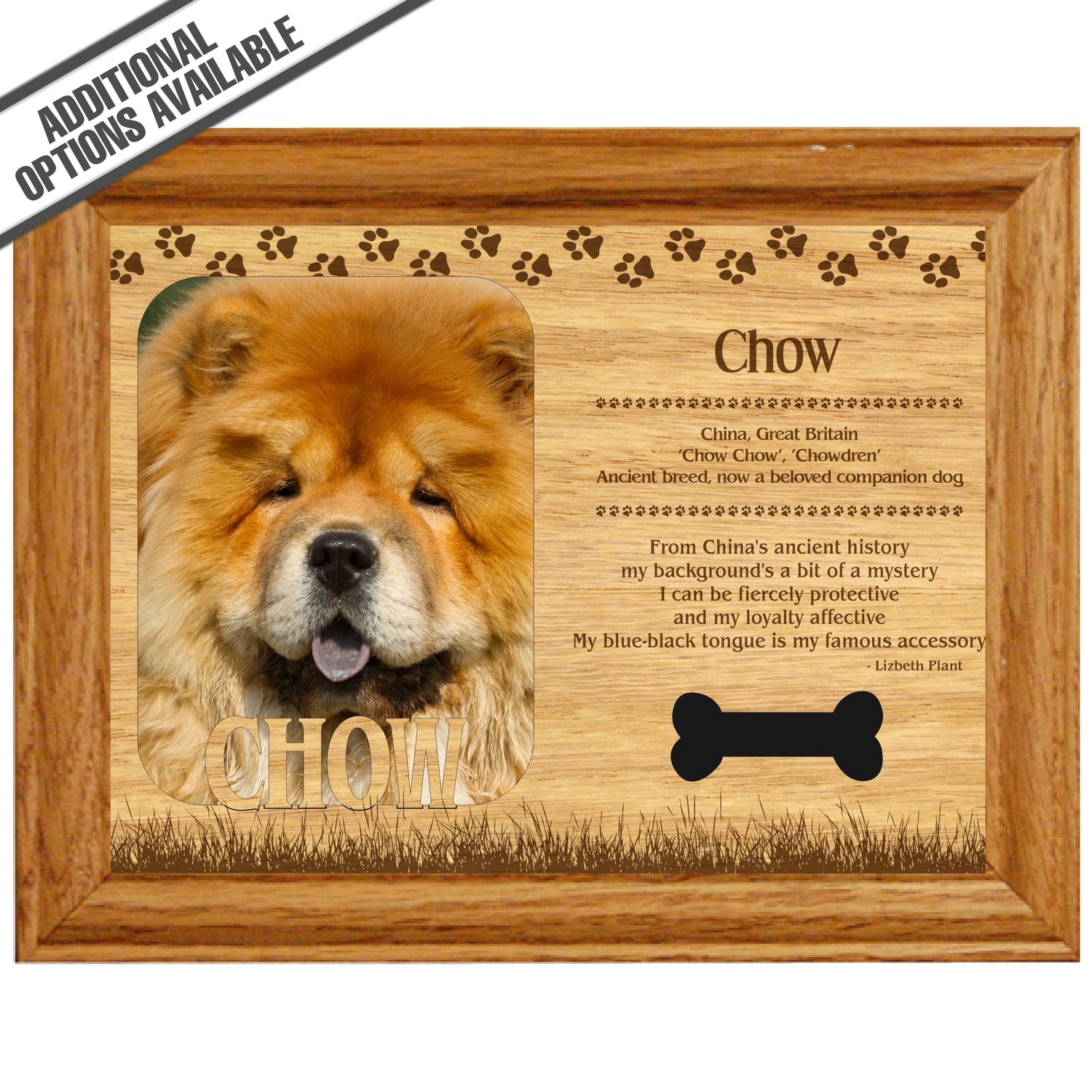 Celebrate the unique bond between you and your dog with our exquisite "Chow Chow" wooden photo frame. This beautifully crafted wooden frame showcases engraved paw print, capturing the essence of your furry friend in a stylish and heartwarming way. Perfect for displaying your favorite photo, this frame not only serves as a cherished keepsake but also highlights the playful and loyal personality traits of the Chow Chow. A thoughtful gift for dog lovers, it adds a personal touch to any home decor while honoring the love and companionship of your pet. Our FrameWorks magnetic mattes are the best way to accentuate any picture. Prefect for a fridge, locker, file cabinet and more, with a strong magnetic backing. Our FrameWorks material is lightweight making it a great souvenir to pack or mail.