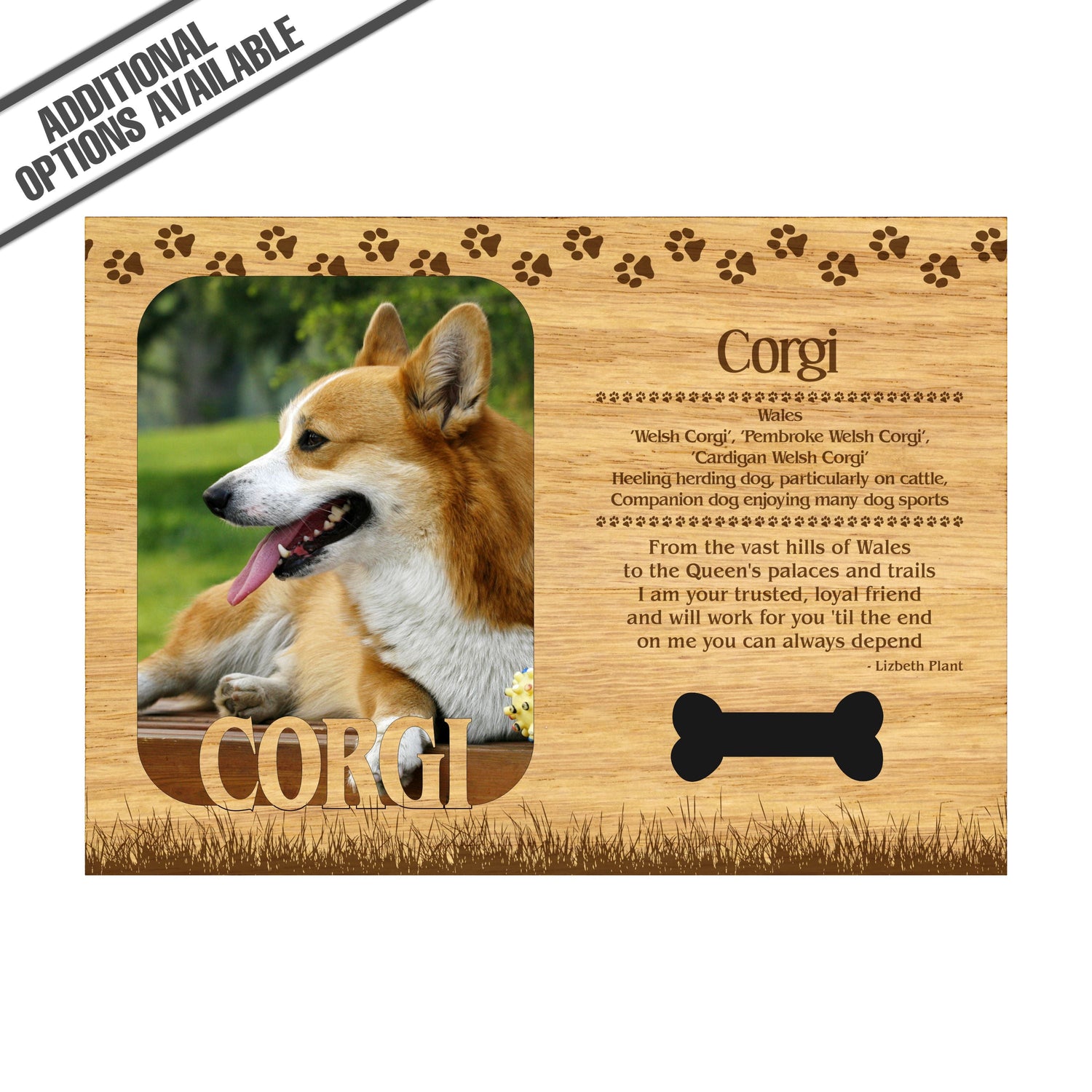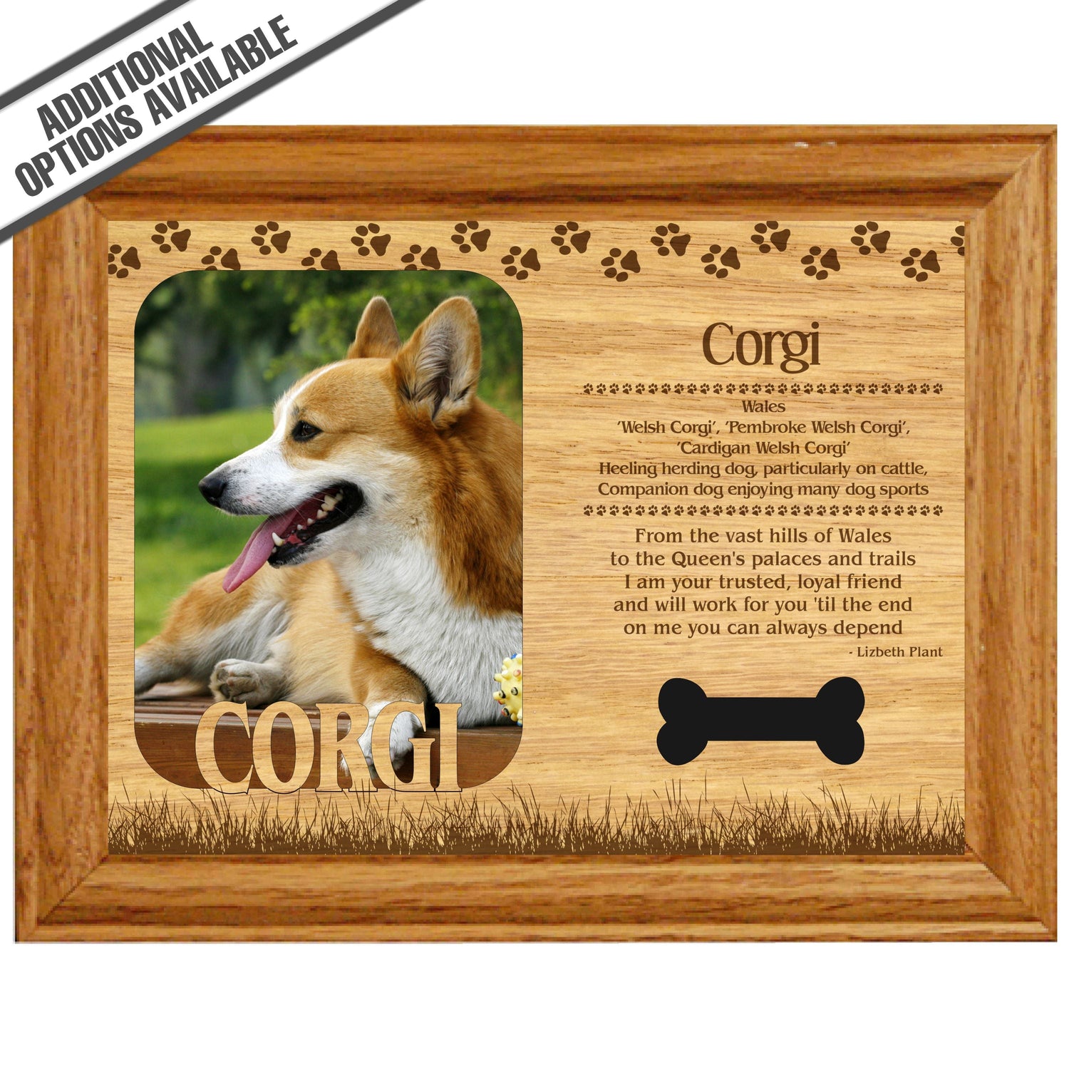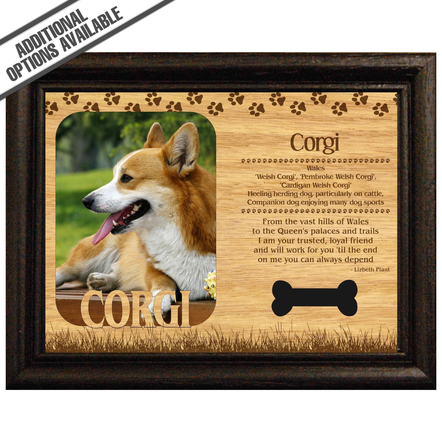 Celebrate the unique bond between you and your dog with our exquisite "Corgi" wooden photo frame. This beautifully crafted wooden frame showcases engraved paw print, capturing the essence of your furry friend in a stylish and heartwarming way. Perfect for displaying your favorite photo, this frame not only serves as a cherished keepsake but also highlights the playful and loyal personality traits of the Corgi. A thoughtful gift for dog lovers, it adds a personal touch to any home decor while honoring the love and companionship of your pet. Our FrameWorks magnetic mattes are the best way to accentuate any picture. Prefect for a fridge, locker, file cabinet and more, with a strong magnetic backing. Our FrameWorks material is lightweight making it a great souvenir to pack or mail.