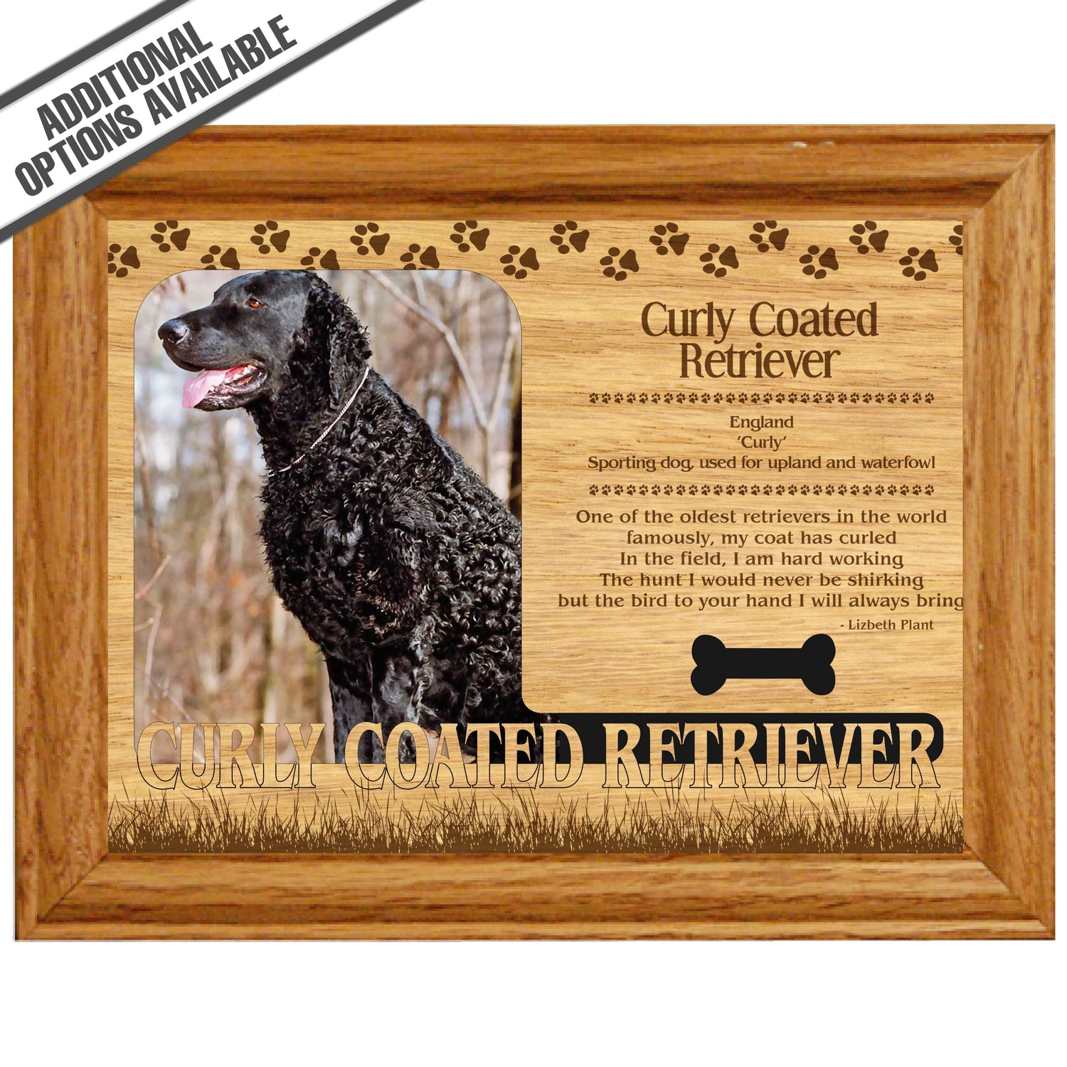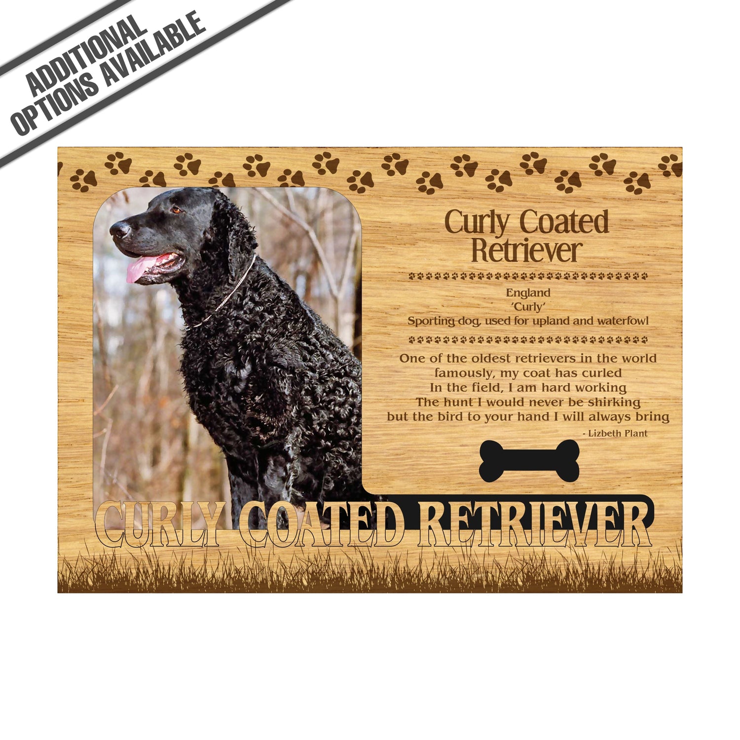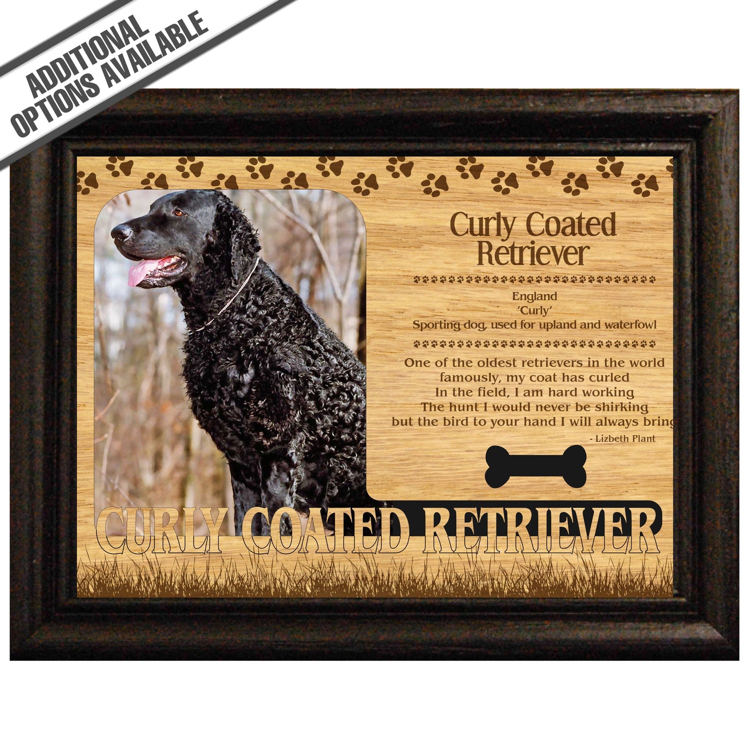 Celebrate the unique bond between you and your dog with our exquisite "Curly Coated Retriever" wooden photo frame. This beautifully crafted wooden frame showcases engraved paw print, capturing the essence of your furry friend in a stylish and heartwarming way. Perfect for displaying your favorite photo, this frame not only serves as a cherished keepsake but also highlights the playful and loyal personality traits of the Curly Coated Retriever. A thoughtful gift for dog lovers, it adds a personal touch to any home decor while honoring the love and companionship of your pet. Our FrameWorks magnetic mattes are the best way to accentuate any picture. Prefect for a fridge, locker, file cabinet and more, with a strong magnetic backing. Our FrameWorks material is lightweight making it a great souvenir to pack or mail.
