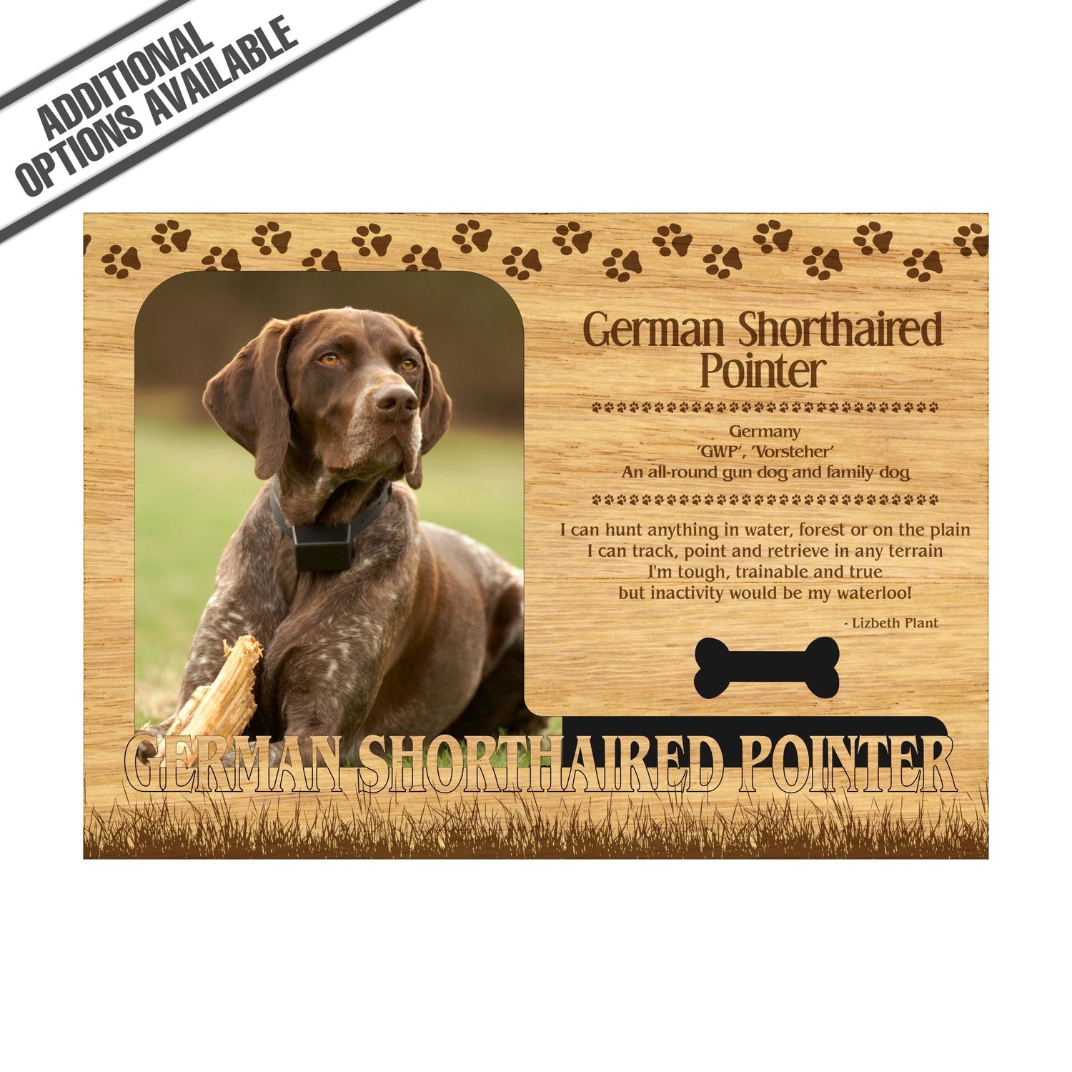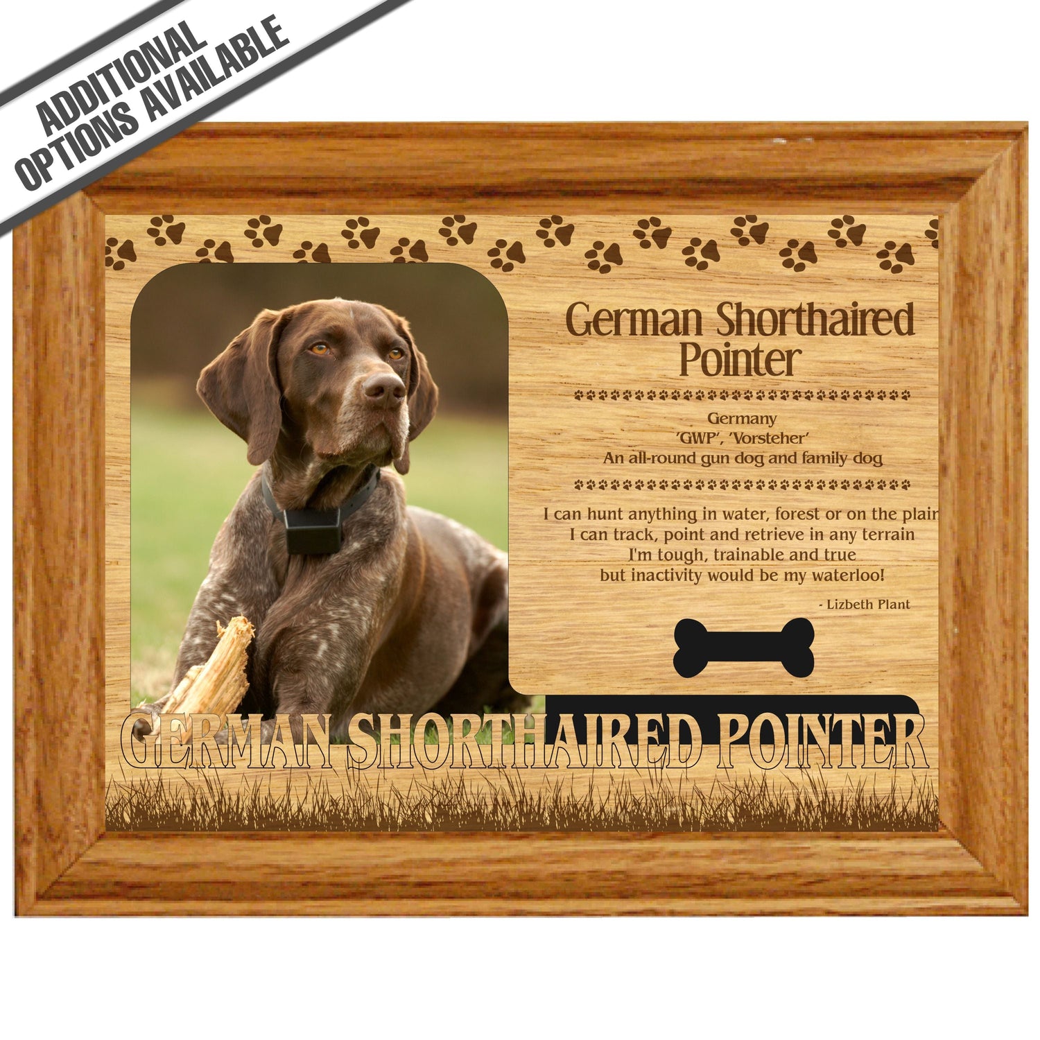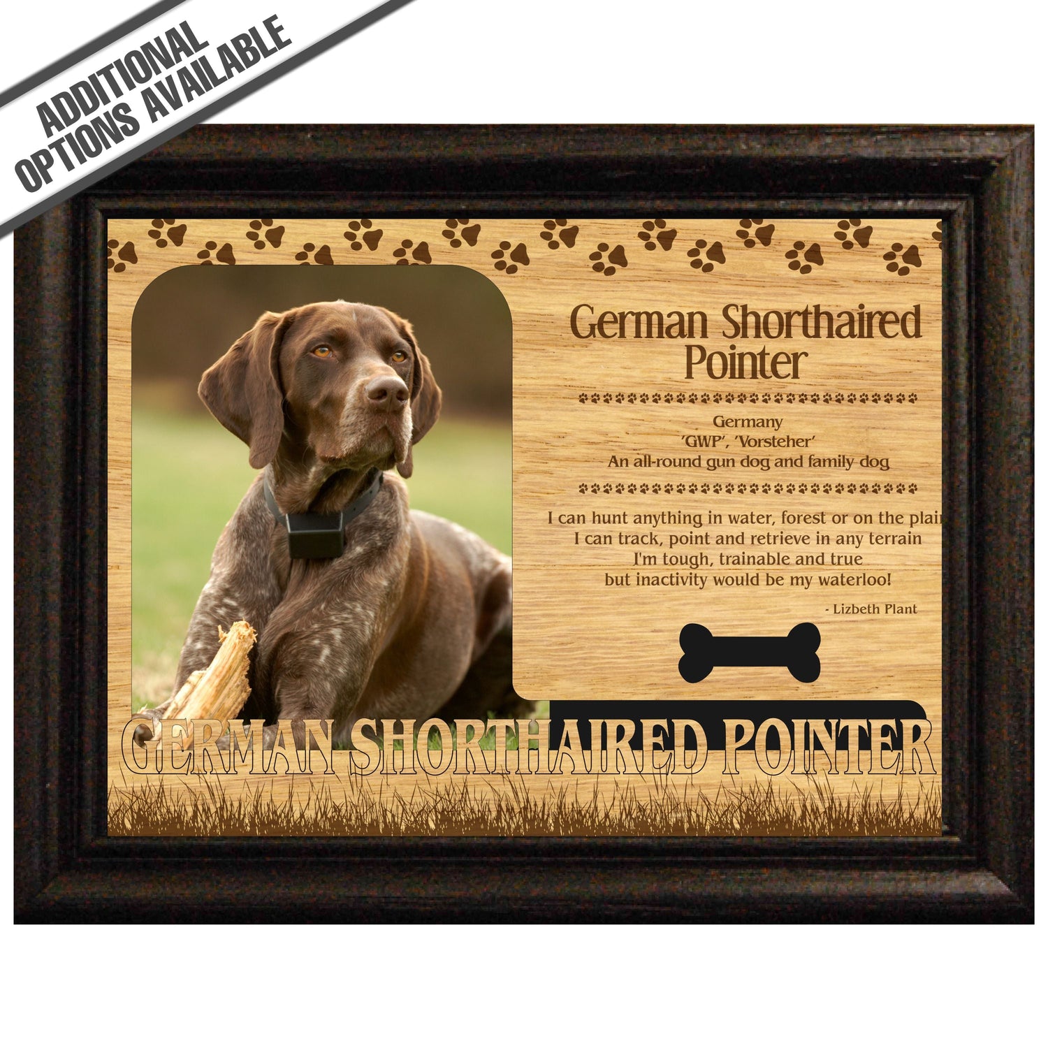 Celebrate the unique bond between you and your dog with our exquisite "German Shorthaired Pointer" wooden photo frame. This beautifully crafted wooden frame showcases engraved paw print, capturing the essence of your furry friend in a stylish and heartwarming way. Perfect for displaying your favorite photo, this frame not only serves as a cherished keepsake but also highlights the playful and loyal personality traits of the German Shorthaired Pointer. A thoughtful gift for dog lovers, it adds a personal touch to any home decor while honoring the love and companionship of your pet. Our FrameWorks magnetic mattes are the best way to accentuate any picture. Prefect for a fridge, locker, file cabinet and more, with a strong magnetic backing. Our FrameWorks material is lightweight making it a great souvenir to pack or mail.