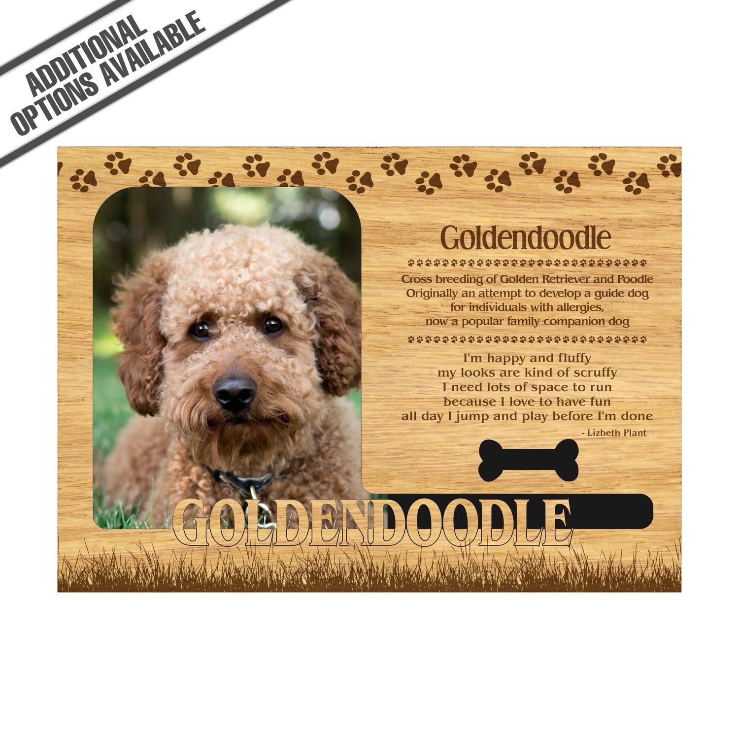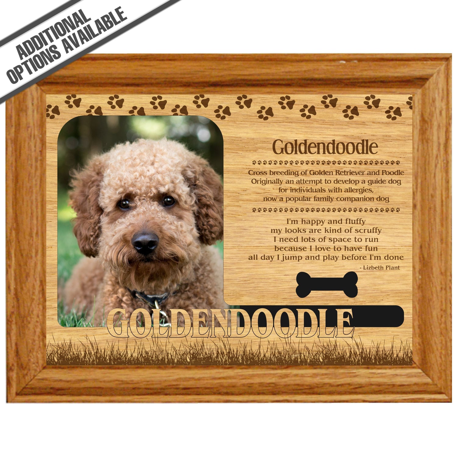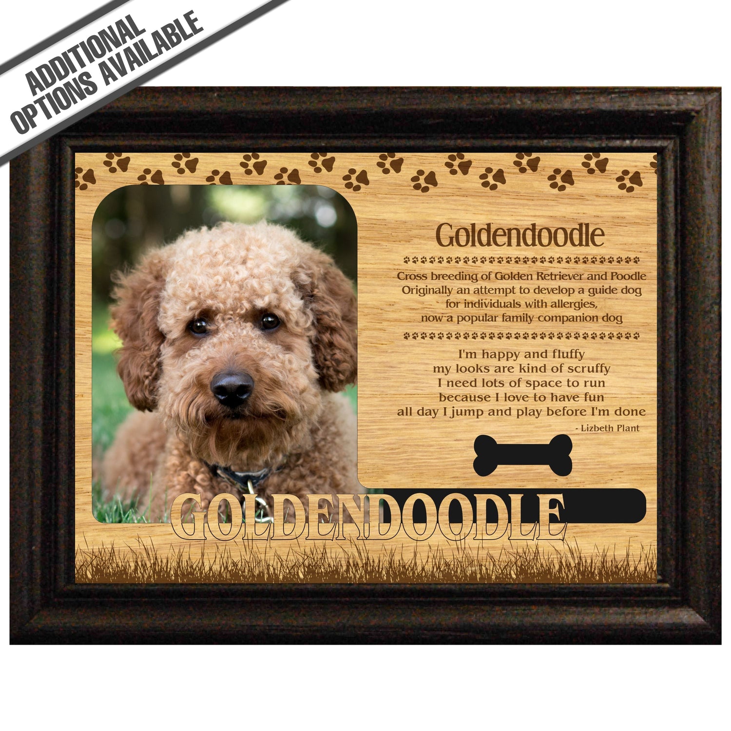 Celebrate the unique bond between you and your dog with our exquisite "Goldendoodle" wooden photo frame. This beautifully crafted wooden frame showcases engraved paw print, capturing the essence of your furry friend in a stylish and heartwarming way. Perfect for displaying your favorite photo, this frame not only serves as a cherished keepsake but also highlights the playful and loyal personality traits of the Goldendoodle. A thoughtful gift for dog lovers, it adds a personal touch to any home decor while honoring the love and companionship of your pet. Our FrameWorks magnetic mattes are the best way to accentuate any picture. Prefect for a fridge, locker, file cabinet and more, with a strong magnetic backing. Our FrameWorks material is lightweight making it a great souvenir to pack or mail.