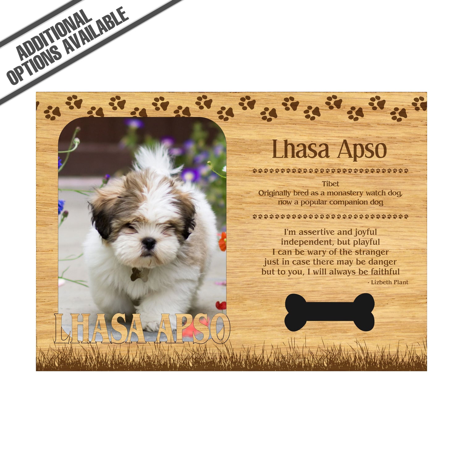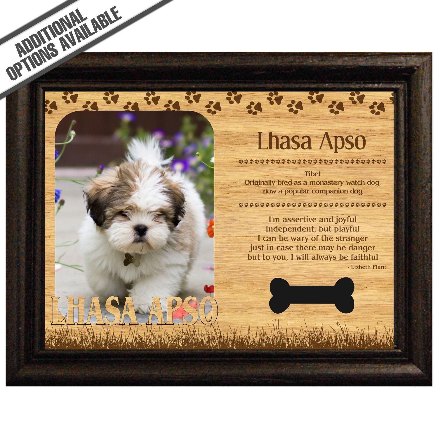 Celebrate the unique bond between you and your dog with our exquisite "Lhasa Apso" wooden photo frame. This beautifully crafted wooden frame showcases engraved paw print, capturing the essence of your furry friend in a stylish and heartwarming way. Perfect for displaying your favorite photo, this frame not only serves as a cherished keepsake but also highlights the playful and loyal personality traits of the Lhasa Apso. A thoughtful gift for dog lovers, it adds a personal touch to any home decor while honoring the love and companionship of your pet. Our FrameWorks magnetic mattes are the best way to accentuate any picture. Prefect for a fridge, locker, file cabinet and more, with a strong magnetic backing. Our FrameWorks material is lightweight making it a great souvenir to pack or mail.