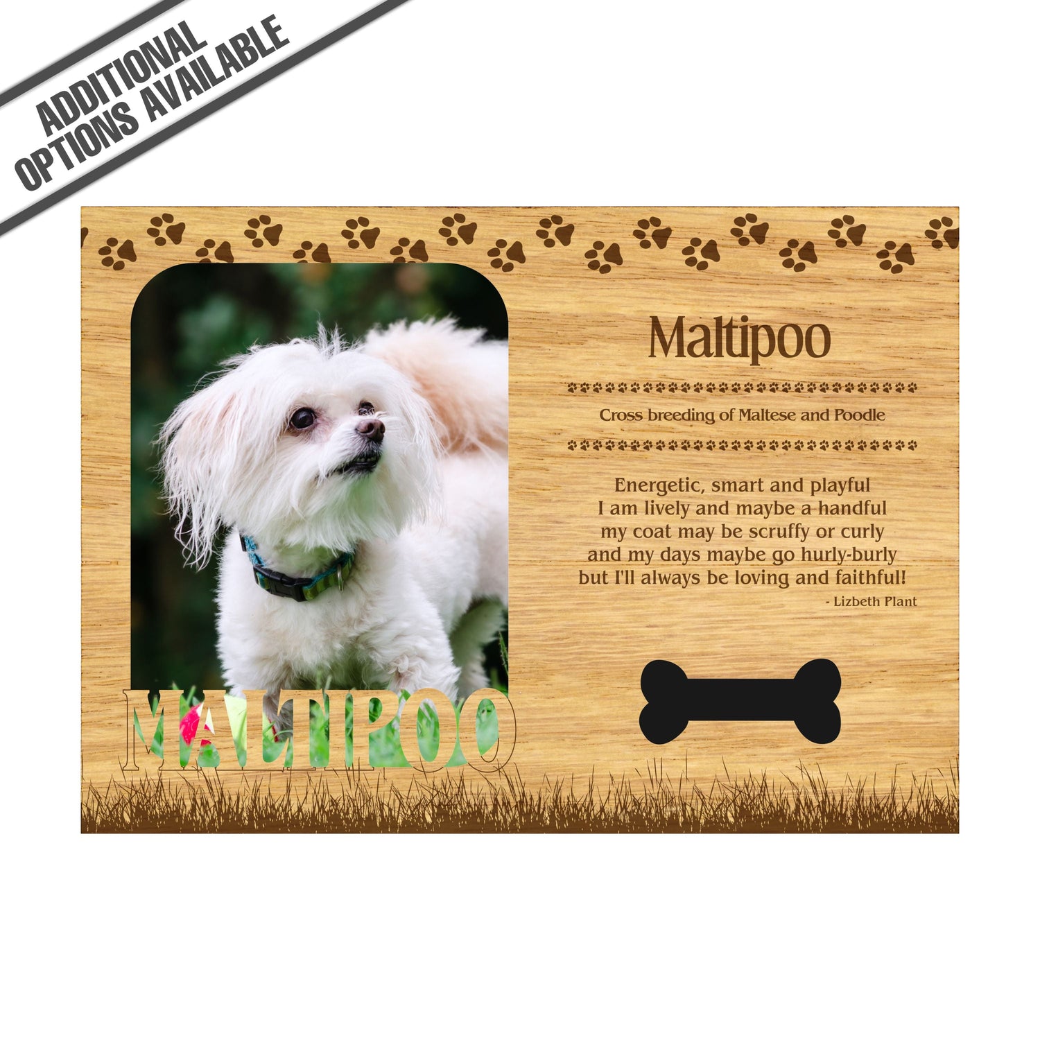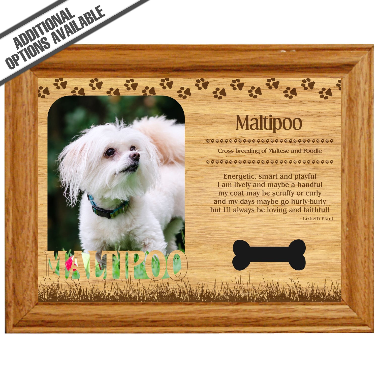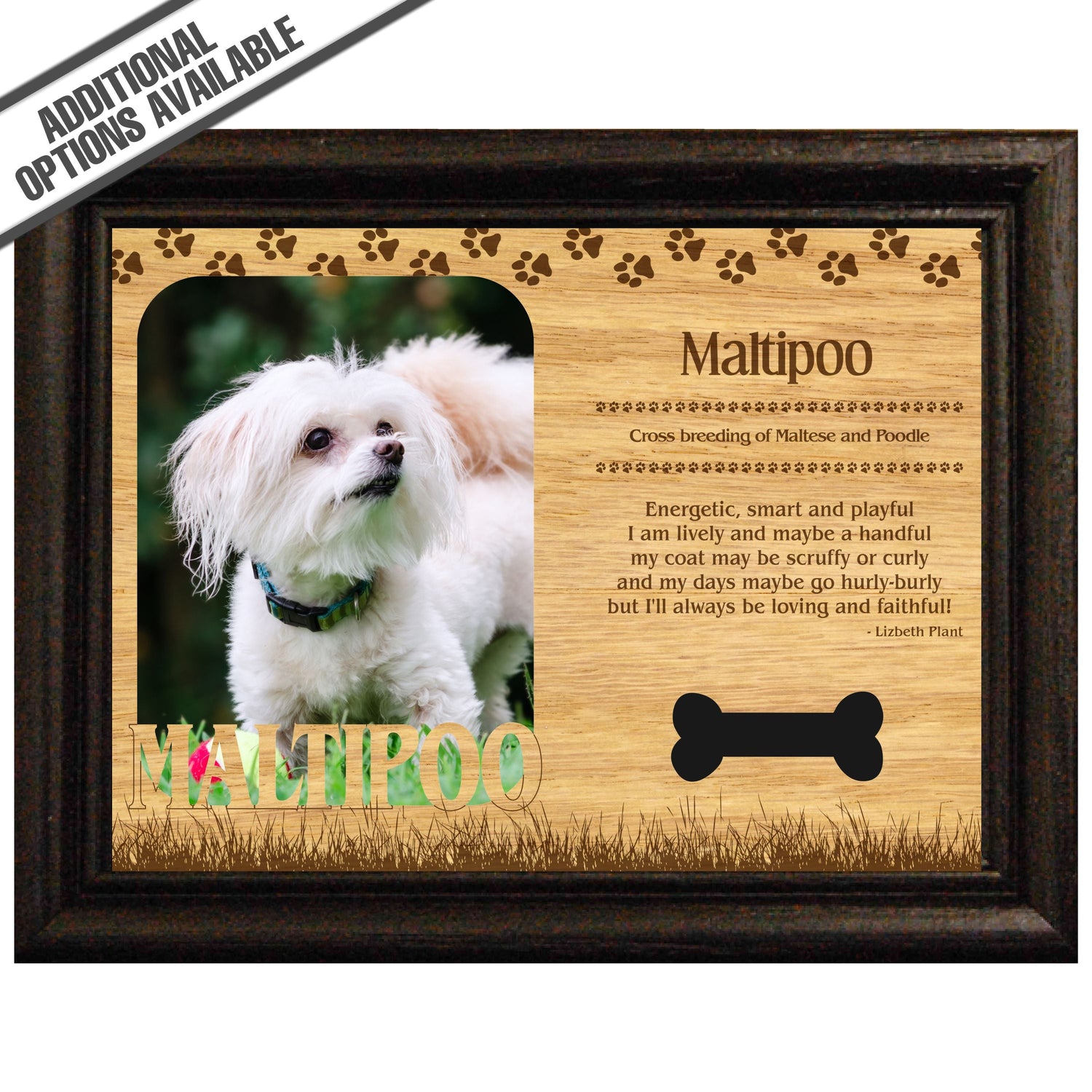 Celebrate the unique bond between you and your dog with our exquisite "Maltipoo" wooden photo frame. This beautifully crafted wooden frame showcases engraved paw print, capturing the essence of your furry friend in a stylish and heartwarming way. Perfect for displaying your favorite photo, this frame not only serves as a cherished keepsake but also highlights the playful and loyal personality traits of the Maltipoo. A thoughtful gift for dog lovers, it adds a personal touch to any home decor while honoring the love and companionship of your pet. Our FrameWorks magnetic mattes are the best way to accentuate any picture. Prefect for a fridge, locker, file cabinet and more, with a strong magnetic backing. Our FrameWorks material is lightweight making it a great souvenir to pack or mail.